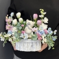 Dekoracja funeralna z misiem osadzona w drewnianej donicy obłożonej korą. Postawa jest obciążona cementem, wypełniona dużą ilością kwiatów, liści i roślinnych dodatków w przepięknej, stonowanej kolorystyce. Szczególnego uroku dodaje jej przepiękny miś umieszczony w kompozycji.