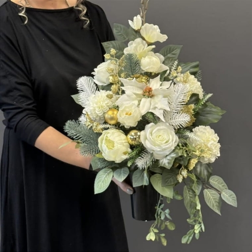 Oryginalna kompozycja nagrobna wykonana z wysokiej jakości roślin sztucznych w zimowej kolorystyce w postaci bukietu wykonanego we wkładzie do wazonu.