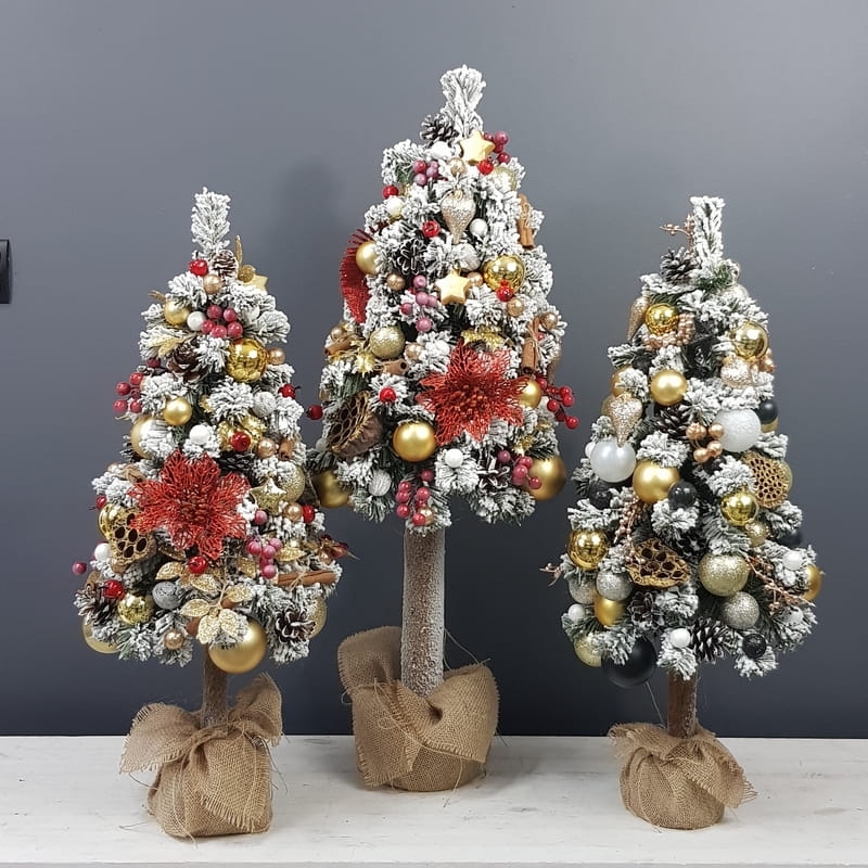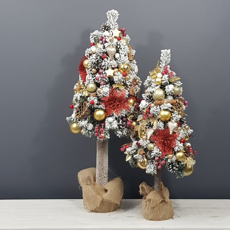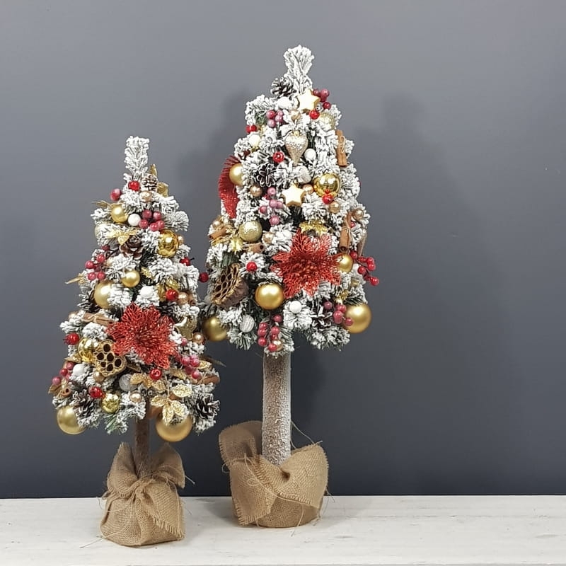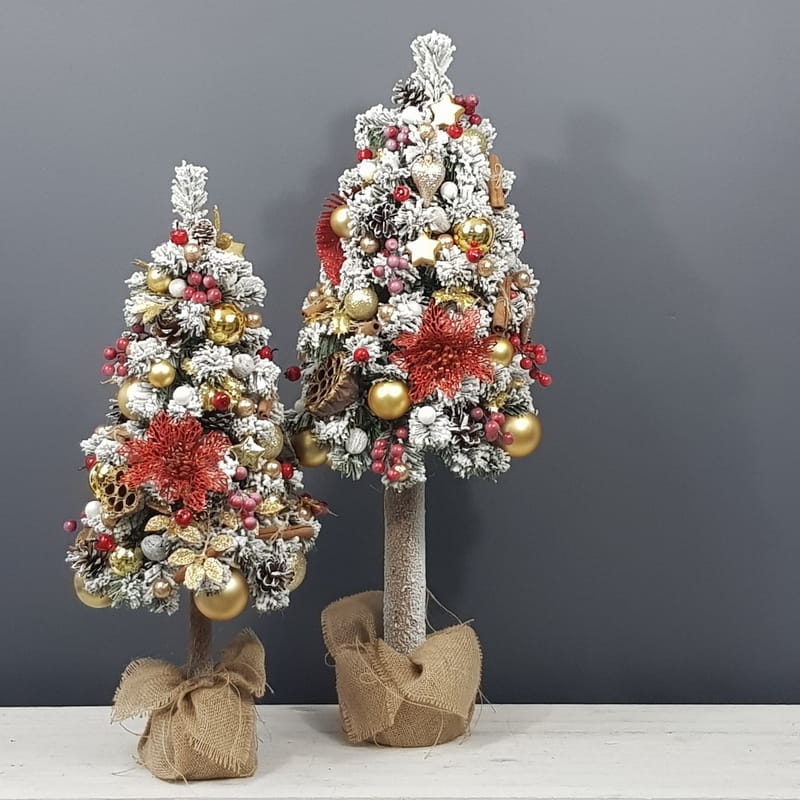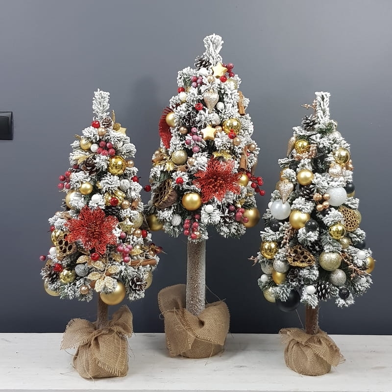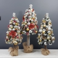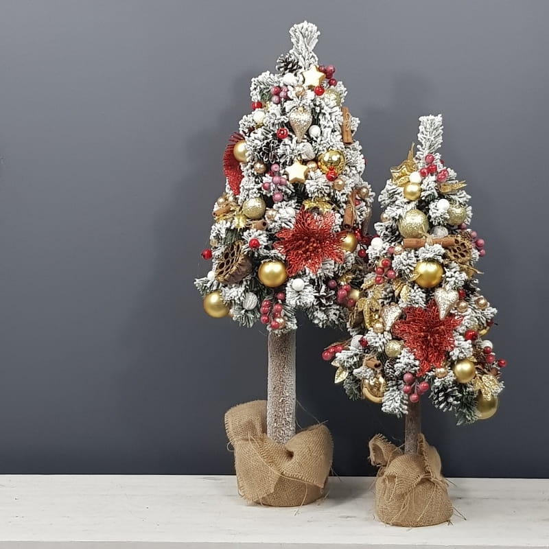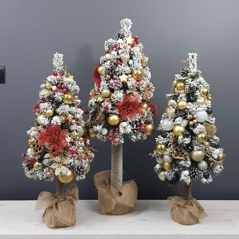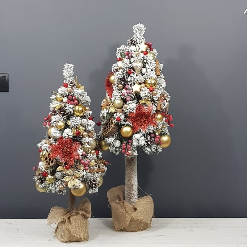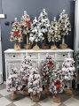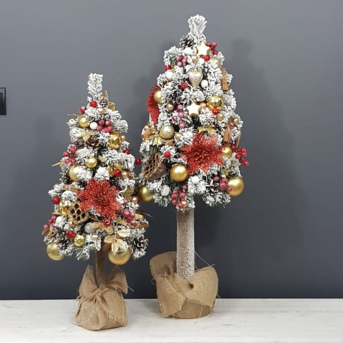 Przepiękna, ośnieżona choinka umieszczona na naturalnym pniu, udekorowana bombkami, kokardami i zawieszkami świątecznymi w czerwono-złotej tonacji. Idealna do postawienia na parapet lub komodę. Choinki z tej kolekcji pięknie wyglądają zestawione obok siebie w różnych rozmiarach. Przedmiotem sprzedaży jest najmniejsza z choinek przedstawionych na zdjęciu. Na zamówienie możemy również wykonać choinkę w innej kolorystyce.