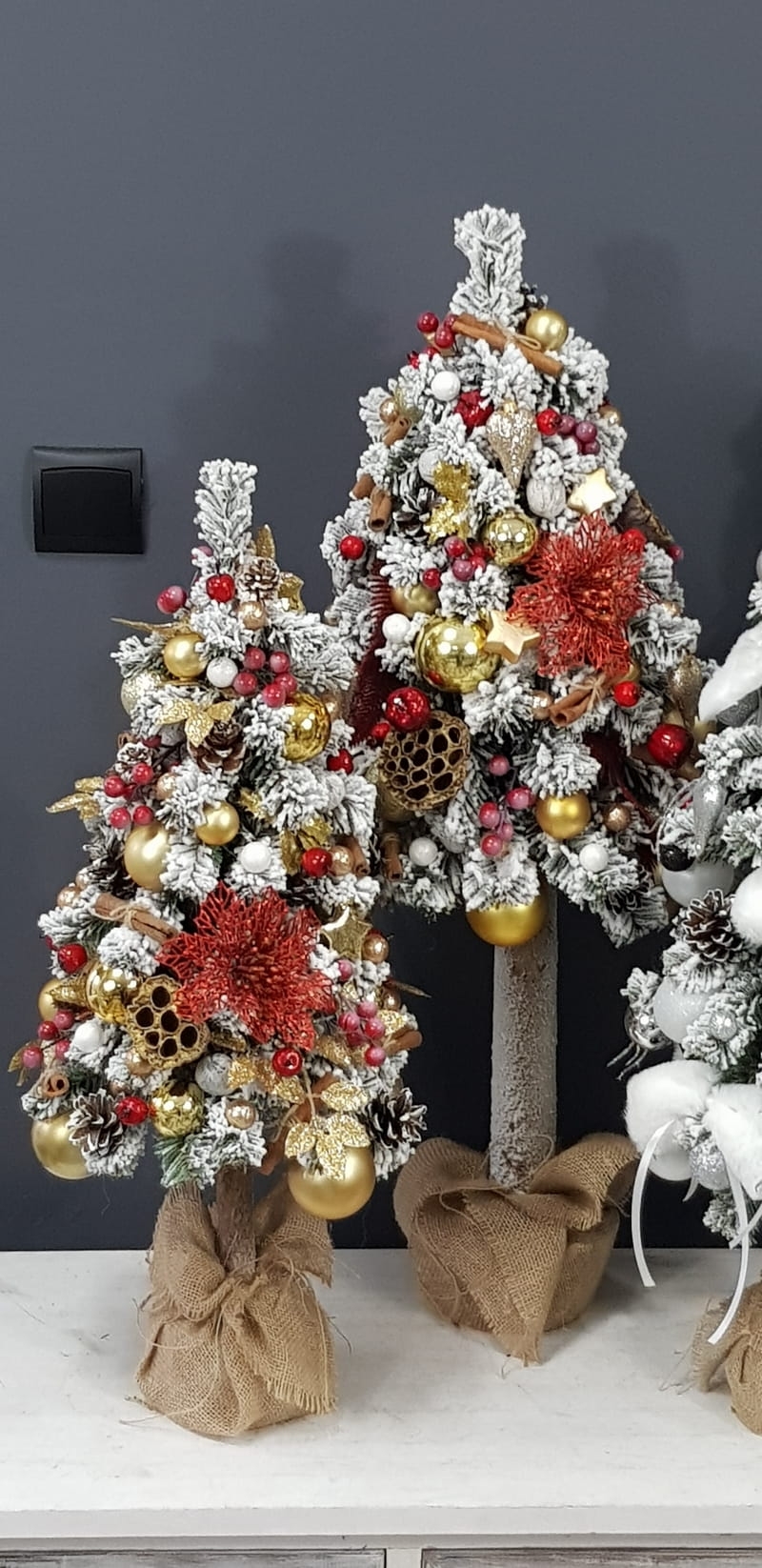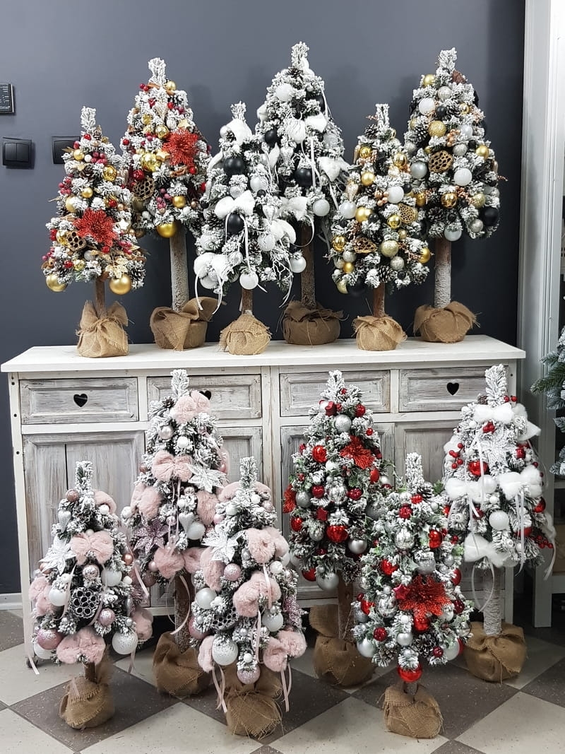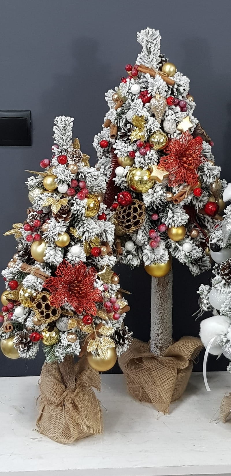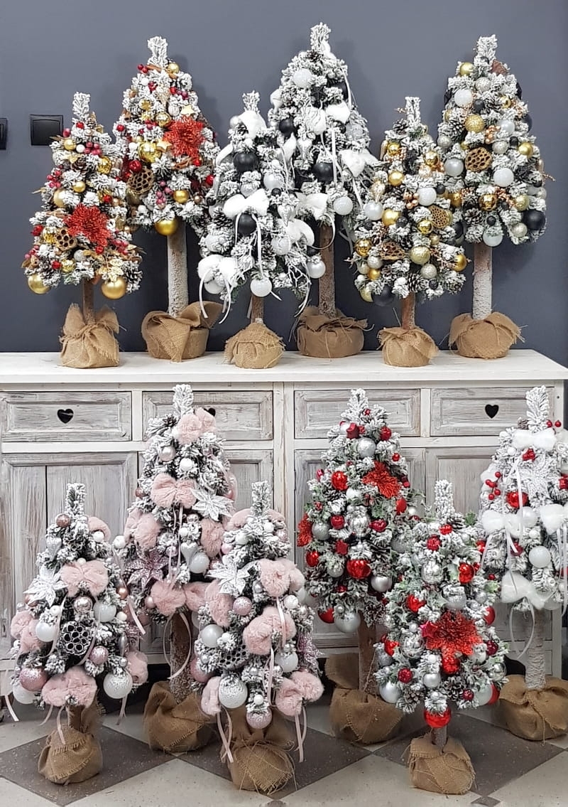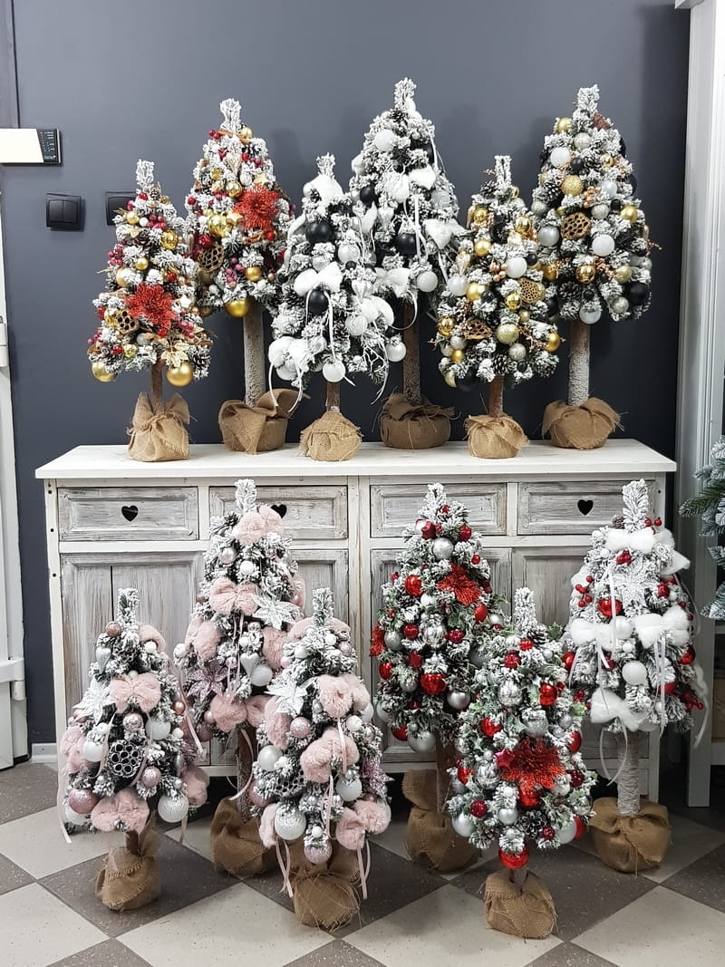 Przepiękna, ośnieżona choinka umieszczona na naturalnym pniu, udekorowana bombkami, kokardami i zawieszkami świątecznymi w czerwono-złotej tonacji. Idealna do postawienia na parapet lub komodę. Choinki z tej kolekcji pięknie wyglądają zestawione obok siebie w różnych rozmiarach. Przedmiotem sprzedaży jest najmniejsza z choinek przedstawionych na zdjęciu. Na zamówienie możemy również wykonać choinkę w innej kolorystyce.