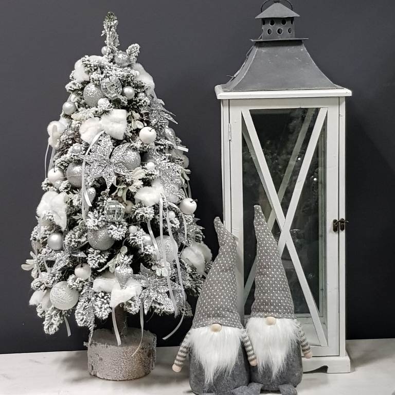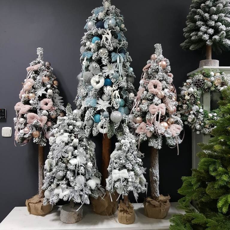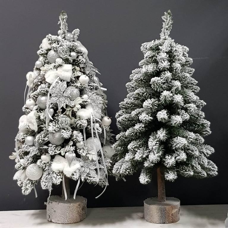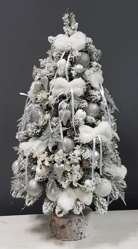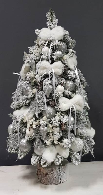 Przepiękna, ośnieżona choinka umieszczona na naturalnym pniu, udekorowana bombkami, kokardami i zawieszkami świątecznymi w srebrnej tonacji. Idealna do postawienia na parapet lub komodę. Choinki z tej kolekcji pięknie wyglądają zestawione obok siebie w różnych rozmiarach. Na zamówienie możemy również wykonać choinkę w innej kolorystyce.