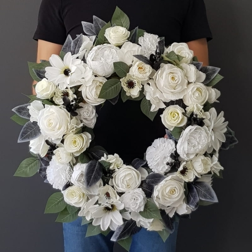 Czarno-biały wieniec kompozycja funeralna wiązanka nagrobna stroik na grób wianek
