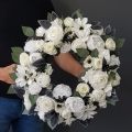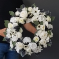 Dekoracja funeralna w postaci kwiatowego wieńca, gotowego do umieszczenia na płycie nagrobkowej. Postawa wykonana z naturalnej słomy, wypełniona dużą ilością kwiatów w przepięknej, stonowanej kolorystyce.