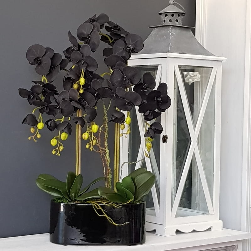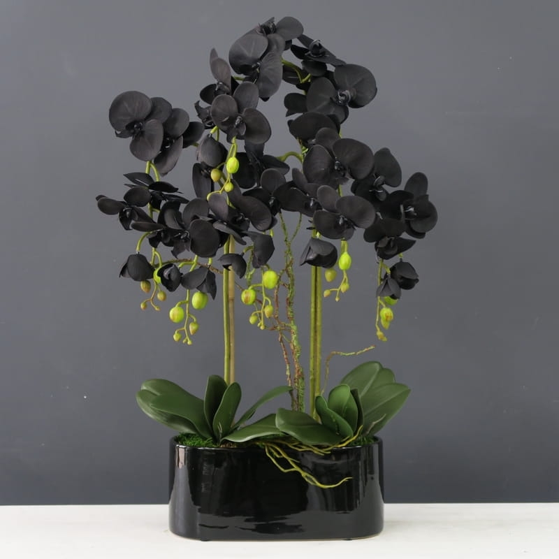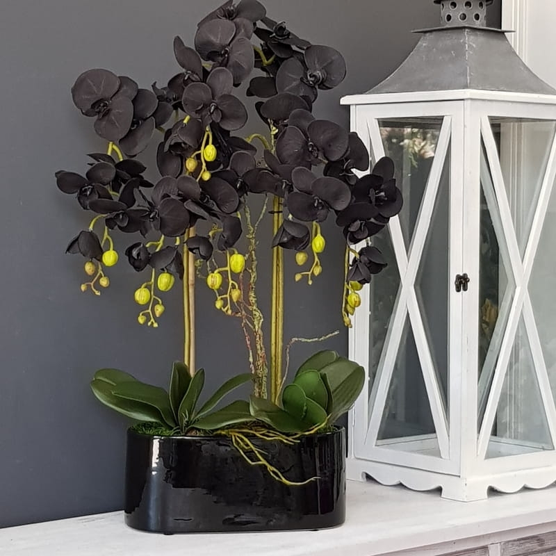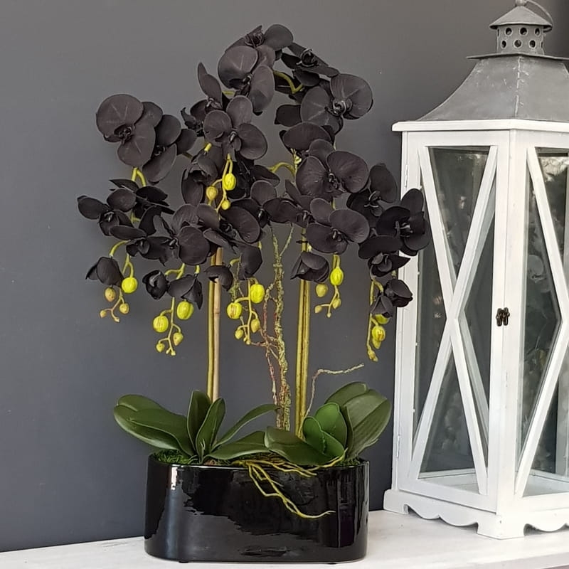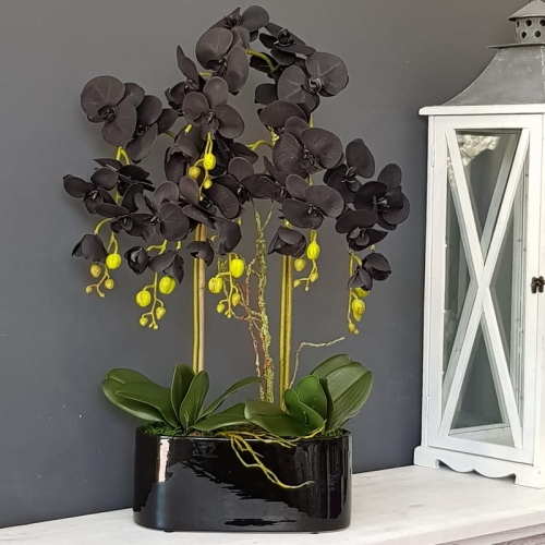 Oryginalna kompozycja z satynowych storczyków w czarnym kolorze, liści i pokaźnej, ceramicznej donicy. Idealny dodatek niemal do każdego wnętrza. Sprawdzi się zarówno w przestrzeni mieszkalnej, jak i biurowej. Doskonale będzie się prezentować również w gabinecie, salonie kosmetycznym czy sali konferencyjnej. Nasze storczyki to trwała dekoracja na długie lata. Donicę należy czyścić wyłącznie na sucho.