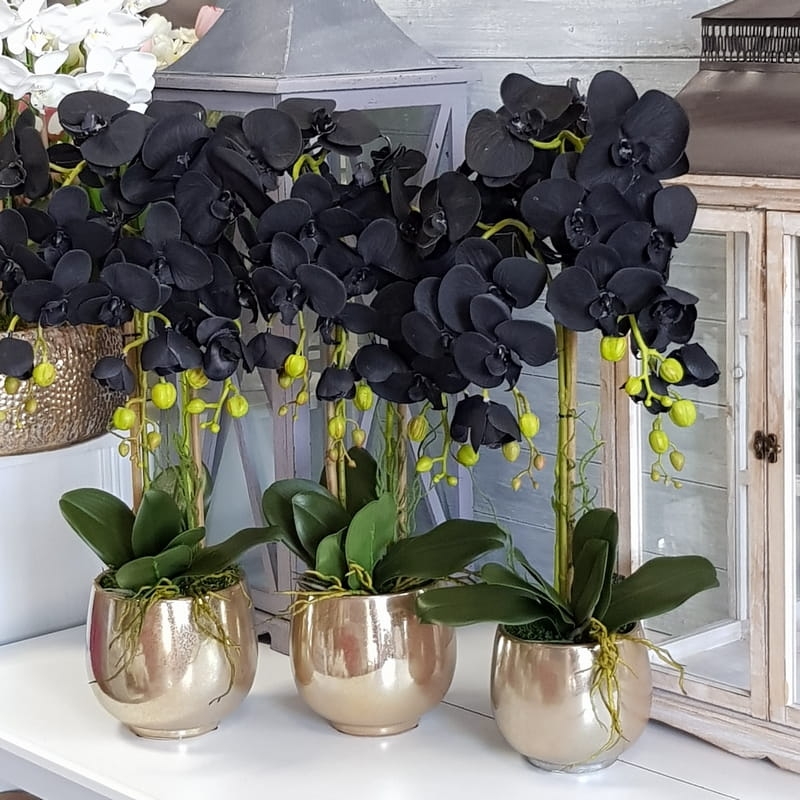 Oryginalna kompozycja z satynowych storczyków w czarnym kolorze, liści i złotej, ceramicznej donicy. Idealny dodatek niemal do każdego wnętrza. Sprawdzi się zarówno w przestrzeni mieszkalnej, jak i biurowej. Doskonale będzie się prezentować również w gabinecie, salonie kosmetycznym czy sali konferencyjnej. Nasze storczyki to trwała dekoracja na długie lata. Donicę należy czyścić wyłącznie na sucho.