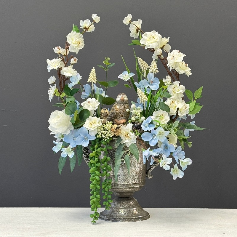 Dekoracyjna kompozycja kwiatowa z ptaszkiem w donicy Marlisa blue