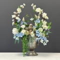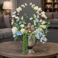 Elegancka kompozycja kwiatowa w donicy o wyrazistym, a jednocześnie harmonijnym charakterze, stworzona z myślą o stylowych aranżacjach wnętrz. Dekoracja została osadzona w postarzanej donicy, która doskonale podkreśla bogactwo form i kolorów kwiatów. Kompozycja utrzymana jest w szlachetnej palecie barw. W aranżacji wykorzystano różnorodne kwiaty dekoracyjne, drobne kwiatostany oraz starannie dobraną zieleń i dekoracyjne gałązki, które nadają całości naturalny, lekko romantyczny wygląd. Zwiewne, opadające elementy roślinne wprowadzają lekkość i przestrzenność, podkreślając nowoczesny charakter kompozycji.