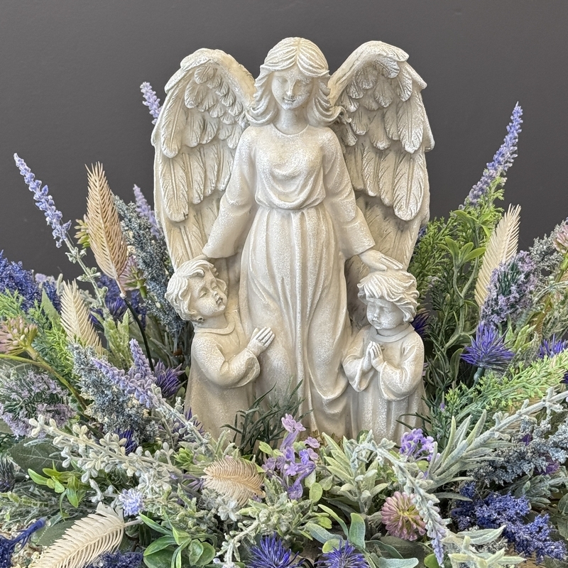 Okazała, a jednocześnie subtelna kompozycja nagrobna z figurką anioła – kobiety otoczonej dwójką małych aniołków. Całość została osadzona w drewnianej donicy pokrytej naturalną korą, która nadaje dekoracji elegancki i naturalny charakter. Stabilność zapewnia solidne obciążenie podstawy. Kompozycja utrzymana jest w fioletowej kolorystyce, inspirowanej polnymi kwiatami. W jej skład wchodzą m.in. lawenda, drobne kwiatki oraz delikatne listki w pudrowej zieleni, które nadają całości świeżości i lekkości wizualnej.