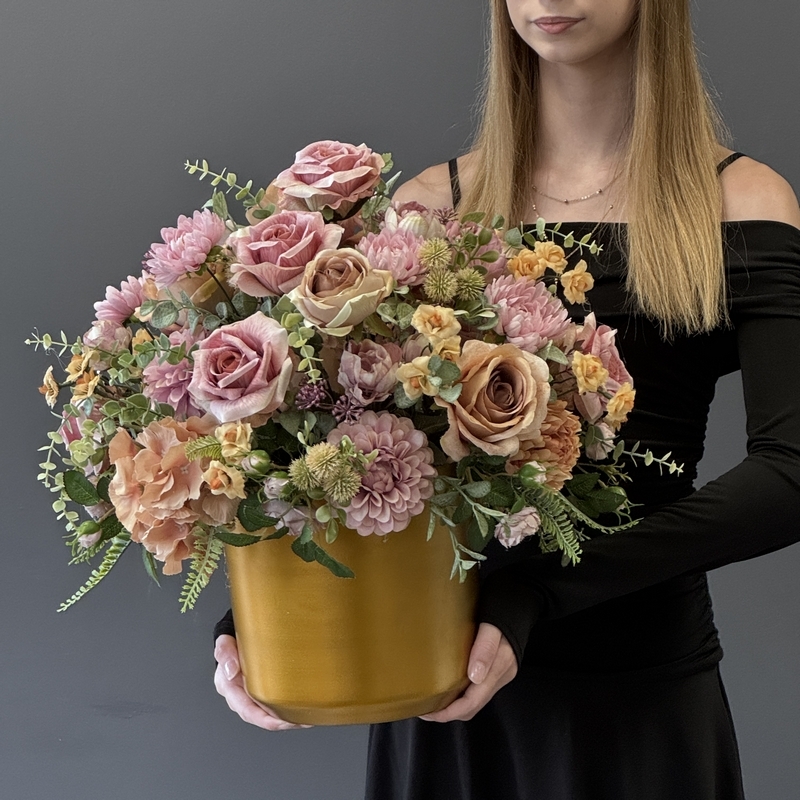 Zestaw kwiatów widoczny na zdjęciu to elegancka i pełna wdzięku kompozycja w dużym, metalowym naczyniu w kolorze złota. Wypełniają go wysokiej jakości kwiaty sztuczne – głównie róże, dalie, piwonie, hortensje i eustomy – utrzymane w romantycznej palecie różów, brzoskwini i kremów. Całość uzupełniają zielone gałązki i paprocie, które dodają lekkości i naturalnego charakteru.