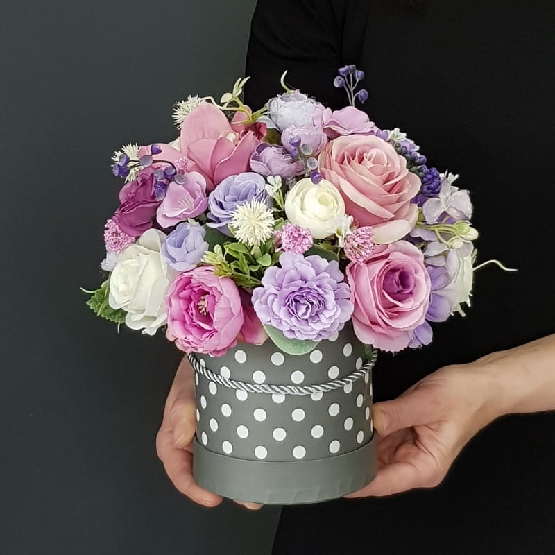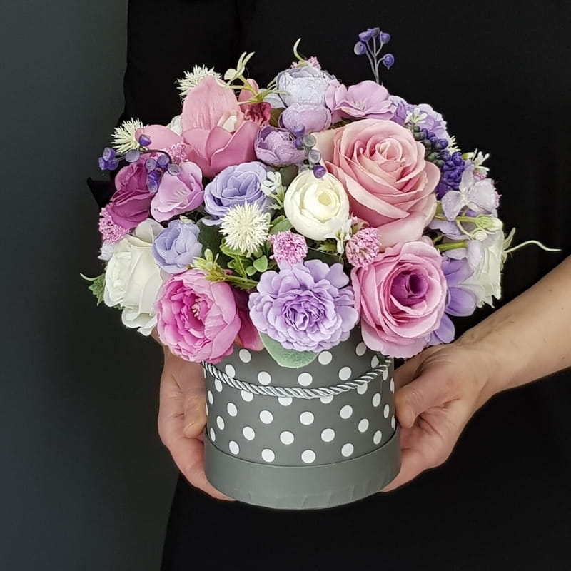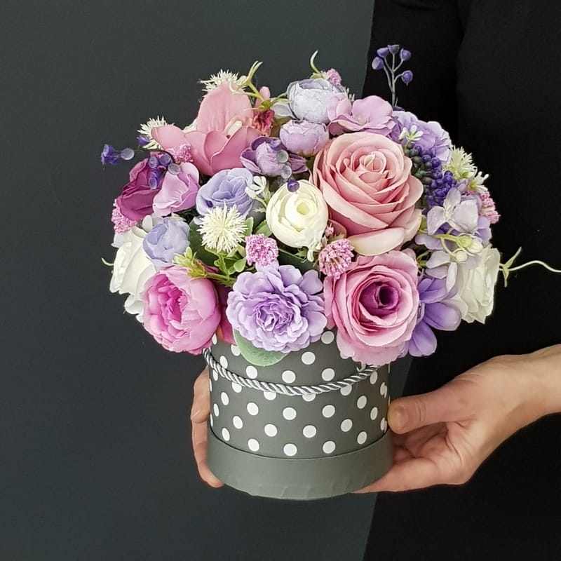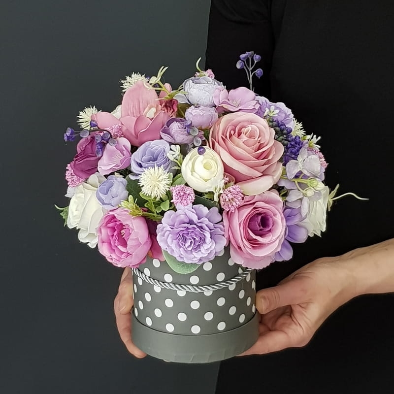 Oryginalna kompozycja kwiatowa wykonana z wysokiej jakości roślin sztucznych, umieszczona w tekturowym pudełku. Całość jest wykonana z dbałością o najdrobniejszy szczegół. Stonowana kolorystyka, uzupełniona zielenią liści sprawia, że kompozycja dopasuje się do różnych rodzajów wnętrz. Dekoracja z każdej strony wygląda nieco inaczej. Polecamy do domów prywatnych, ale również do obiektów użyteczności publicznej. Nasze kompozycje to wspaniałe uzupełnienie hotelowych i restauracyjnych wnętrz, a także salonów spa, gabinetów kosmetycznych i lekarskich, klinik i poradni.