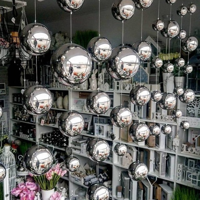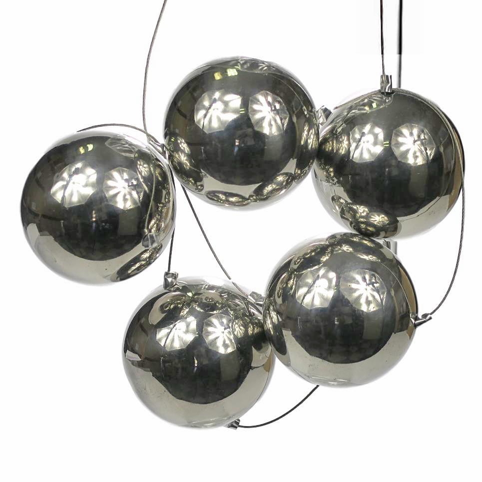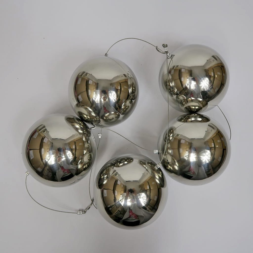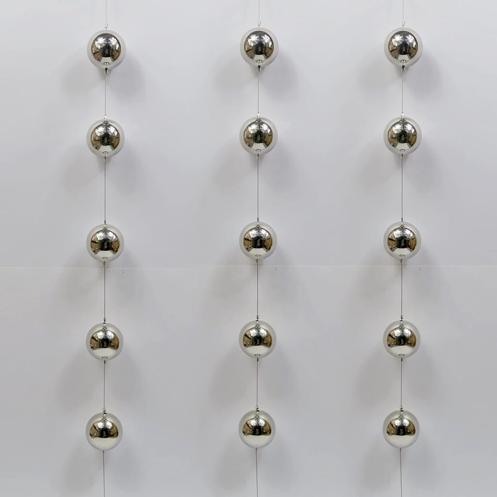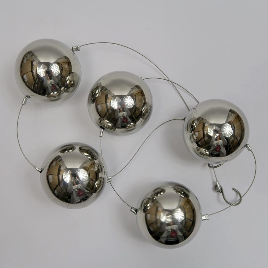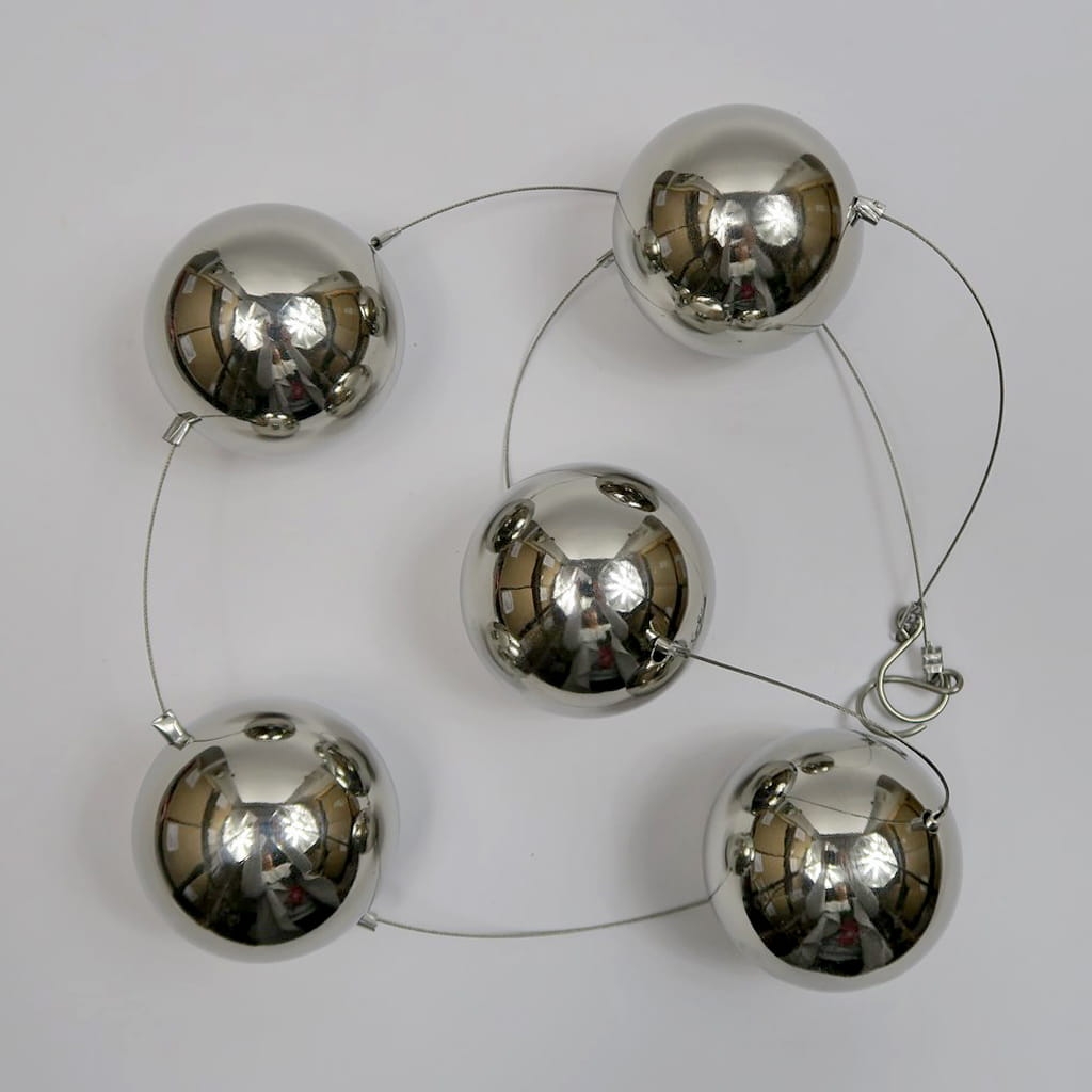 Piękna, dekoracyjna girlanda wykonana z połączonych ze sobą lekkich, metalowych kul w srebrnym kolorze. Szczególnego uroku dodaje im gładka powierzchnia, która pięknie odbija światło. Kulki pięknie prezentują się w towarzystwie srebrnych świeczników. Idealne do wystroju wnętrza w niemal każdym stylu. Doskonale prezentują się zawieszone w oknie lub na tarasie. Są mrozoodporne. Z obu stron posiada metalowy haczyk ułatwiający zawieszenie lub połączenie kilku girland. Girlanda składa się z 5 kulek o średnicy 6 cm. Całkowita długość to 100 cm. Dobry pomysł na prezent dla bliskiej osoby.