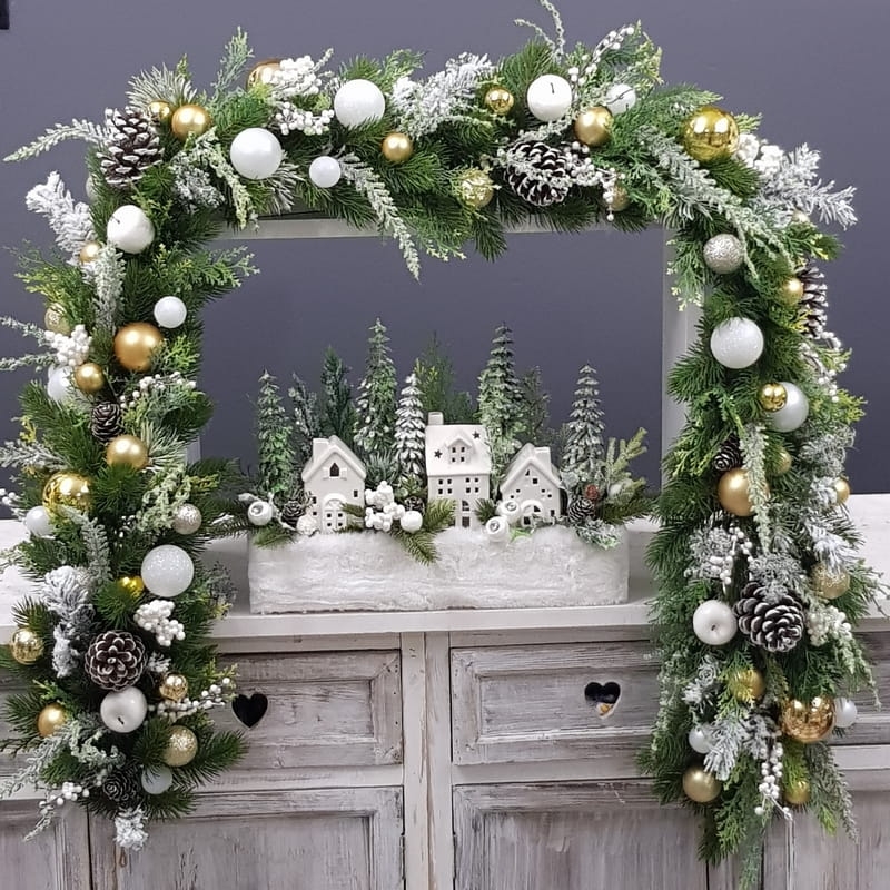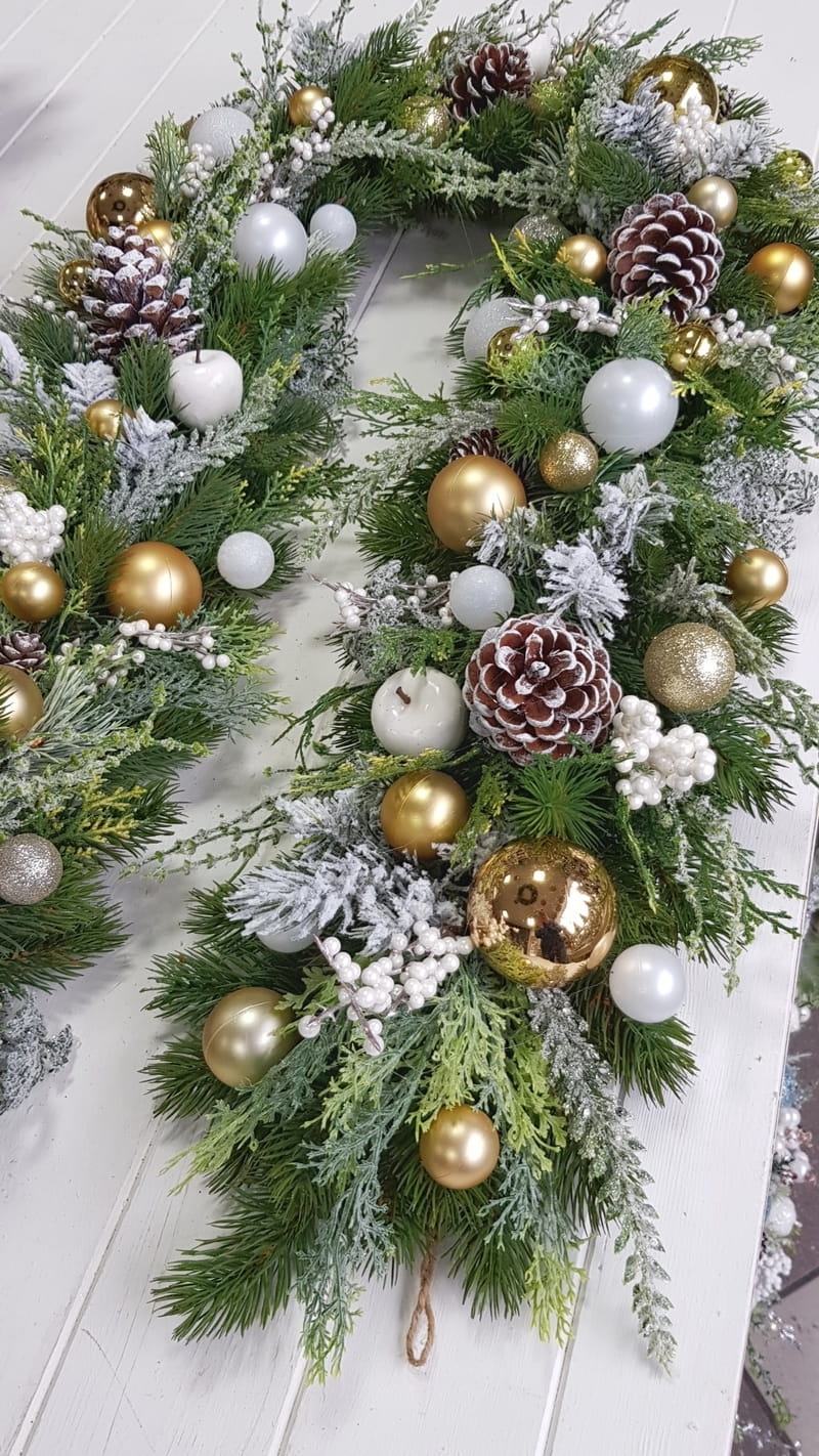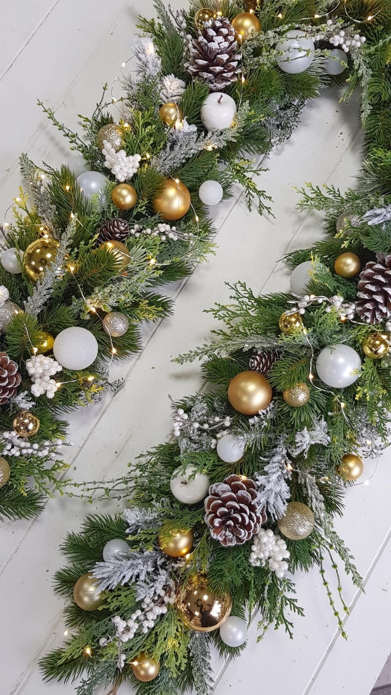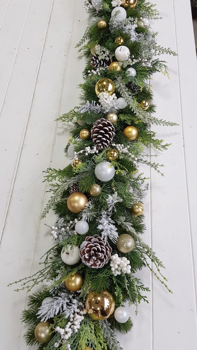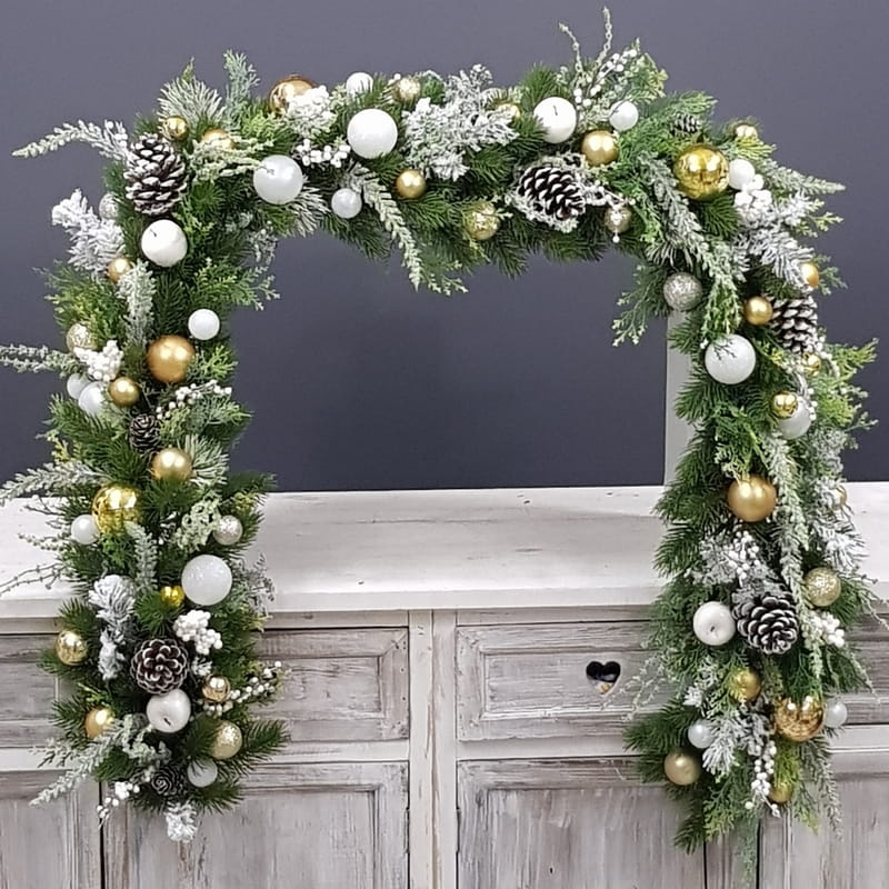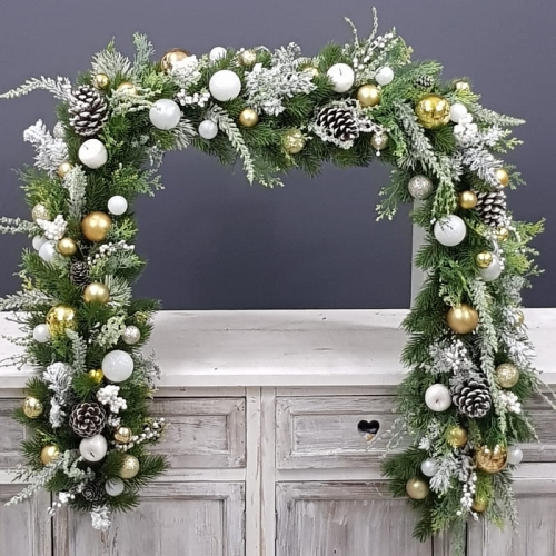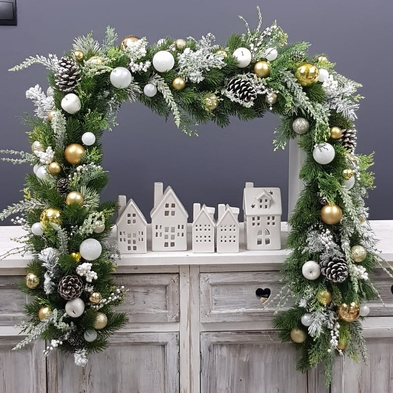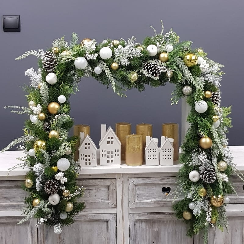 Dekoracyjna girlanda w biało-złotej kolorystyce. Całość jest wykonana z dbałością o najdrobniejszy szczegół. Rośliny i dodatki są dopasowane kolorystycznie tak, aby tworzyły spójną całość. Idealna do mieszkania, na prezent lub do sesji fotograficznych.