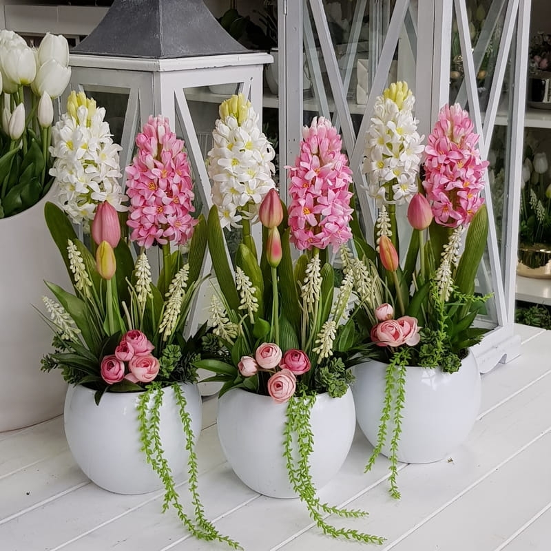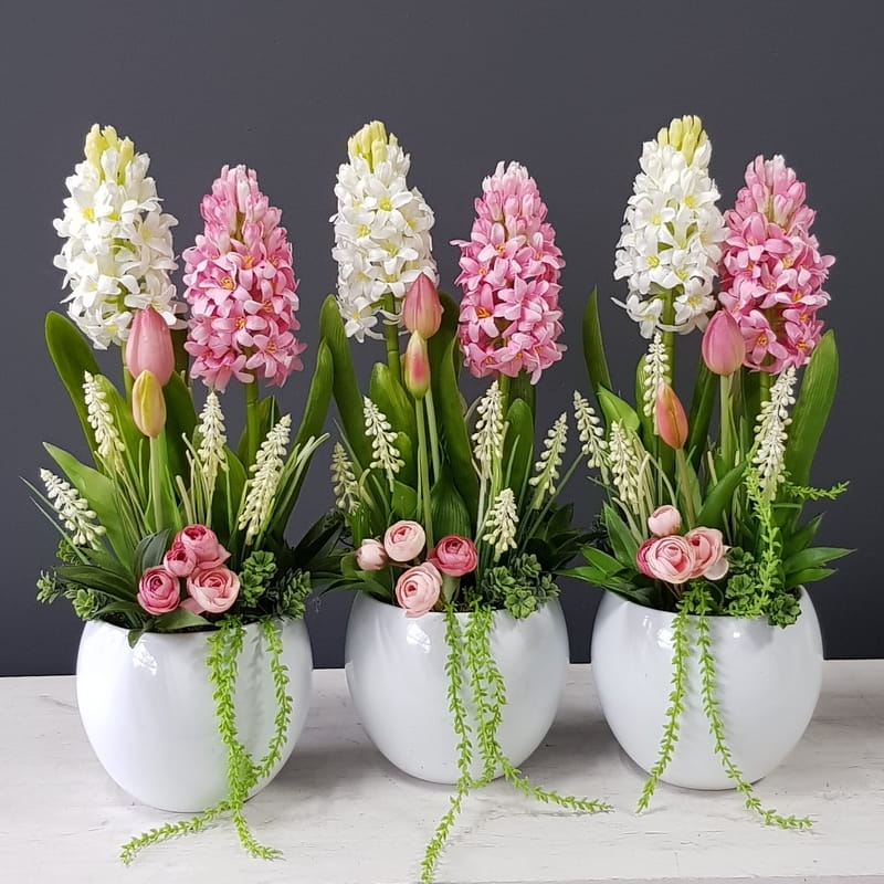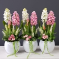 Oryginalna kompozycja roślinna, wykonana z wysokiej jakości hiacyntów, zielonych dodatków oraz ceramiki. Idealnie sprawdzi się jako ozdoba mieszkań zarówno w stylu klasycznym, jak i nowoczesnym. Pięknie będzie się prezentowała na komodzie czy parapecie. Polecamy jako oryginalny pomysł na prezent.
