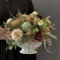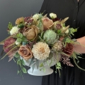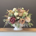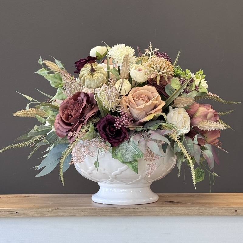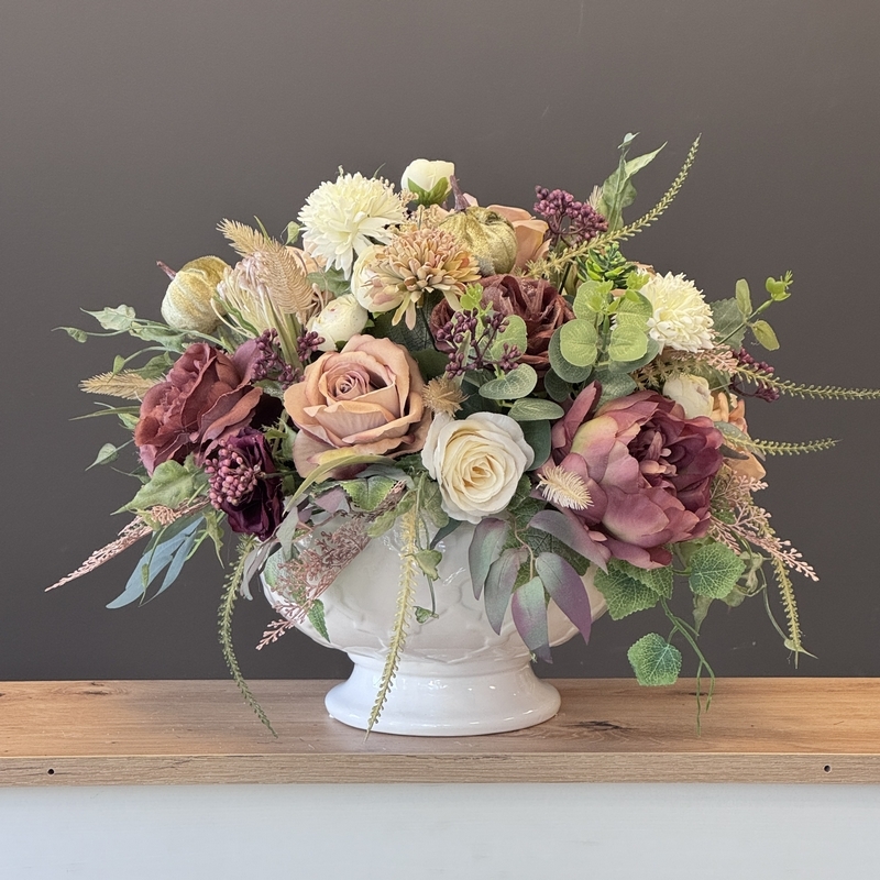 Elegancka dekoracja ze sztucznych kwiatów, umieszczona w stylowym ceramicznym naczyniu. Kompozycję tworzą starannie dobrane rośliny w ciepłych, jesiennych barwach – odcieniach brązu, beżu, kremu i delikatnej zieleni. Całość uzupełniają dodatki do złudzenia przypominające naturalne: wysokiej jakości kwiaty, gałązki, pudrowe liście i drobne owoce, które podkreślają sezonowy charakter aranżacji.