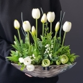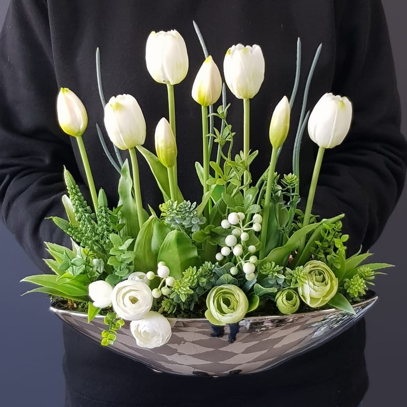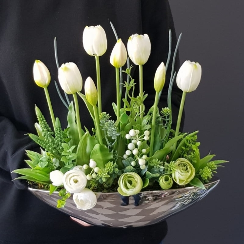 Kompozycja Canoe białe kwiaty tulipany gumowe silver 33cm