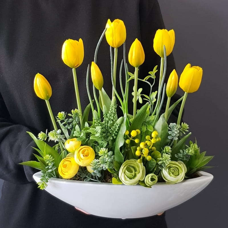 Oryginalna kompozycja roślinna, wykonana z wysokiej jakości silikonowych tulipanów, zielonych dodatków oraz ceramicznej donicy w kształcie łódki. Idealnie sprawdzi się jako ozdoba mieszkań zarówno w stylu klasycznym, jak i nowoczesnym. Pięknie będzie się prezentowała na ławie, komodzie czy parapecie. Polecamy również do dekoracji wnętrz biur, salonów kosmetycznych, gabinetów. Sztuczne kompozycje kwiatowe sprawdzą się we wnętrzach z ograniczonym dostępem światła oraz tam, gdzie ze względów higienicznych niemożliwe jest zastosowanie żywych roślin.