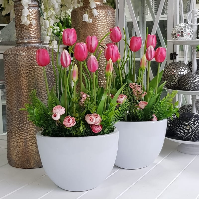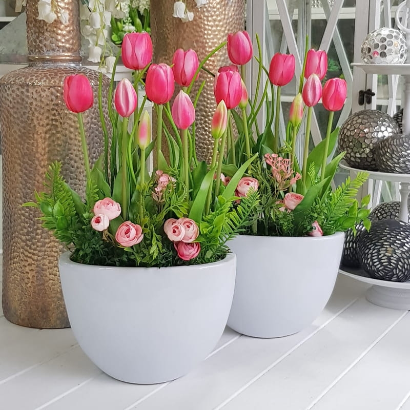 Oryginalna kompozycja roślinna, wykonana z wysokiej jakości silikonowych tulipanów, zielonych dodatków oraz ceramiki. Idealnie sprawdzi się jako ozdoba mieszkań zarówno w stylu klasycznym, jak i nowoczesnym. Pięknie będzie się prezentowała na komodzie czy parapecie. Polecamy jako oryginalny pomysł na prezent.