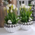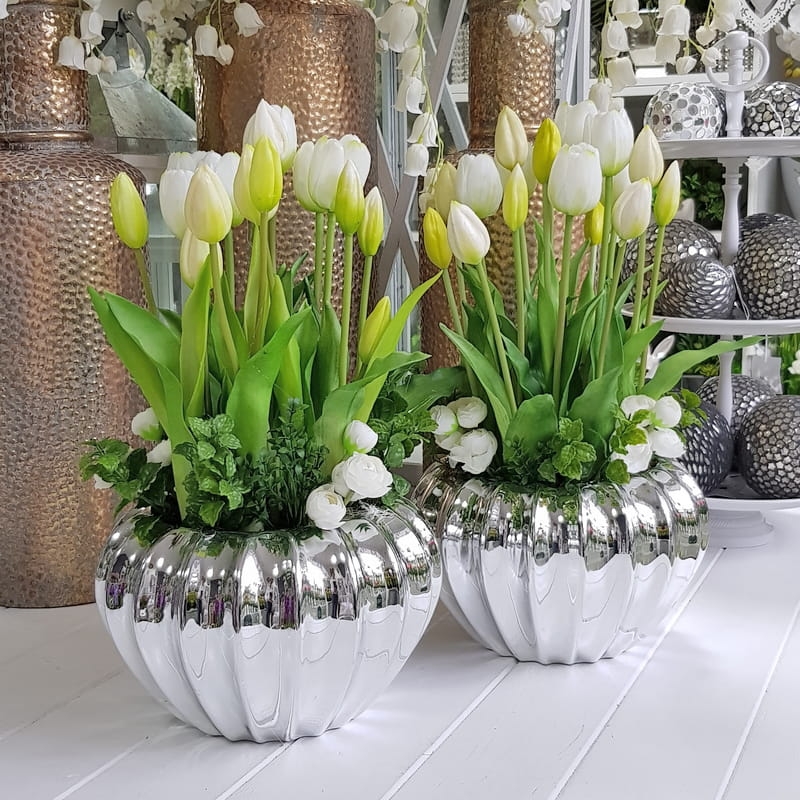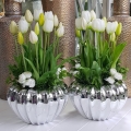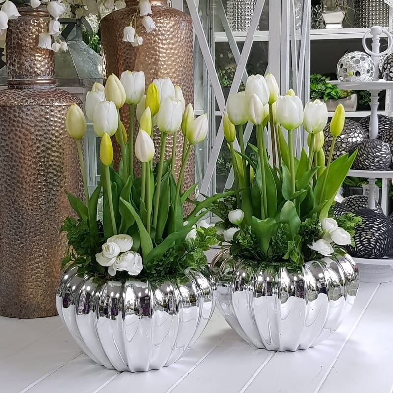 Oryginalna kompozycja roślinna, wykonana z silikonowych tulipanów, zielonych dodatków oraz ceramicznej donicy. Idealnie sprawdzi się jako ozdoba mieszkań zarówno w stylu klasycznym, jak i nowoczesnym. Pięknie będzie się prezentowała na komodzie czy parapecie. Polecamy jako oryginalny pomysł na prezent.