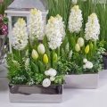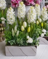 Oryginalna kompozycja roślinna, wykonana z hiacyntów, szafirków, tulipanów, bratków, pełników i zielonych dodatków oraz ceramicznej donicy. Idealnie sprawdzi się jako ozdoba mieszkań zarówno w stylu klasycznym, jak i nowoczesnym. Pięknie będzie się prezentowała na komodzie czy parapecie. Polecamy jako oryginalny pomysł na prezent.