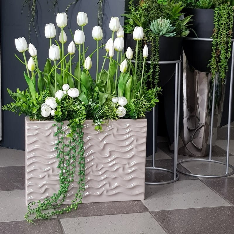 Kompozycja Wave białe tulipany donica beż XL pozioma