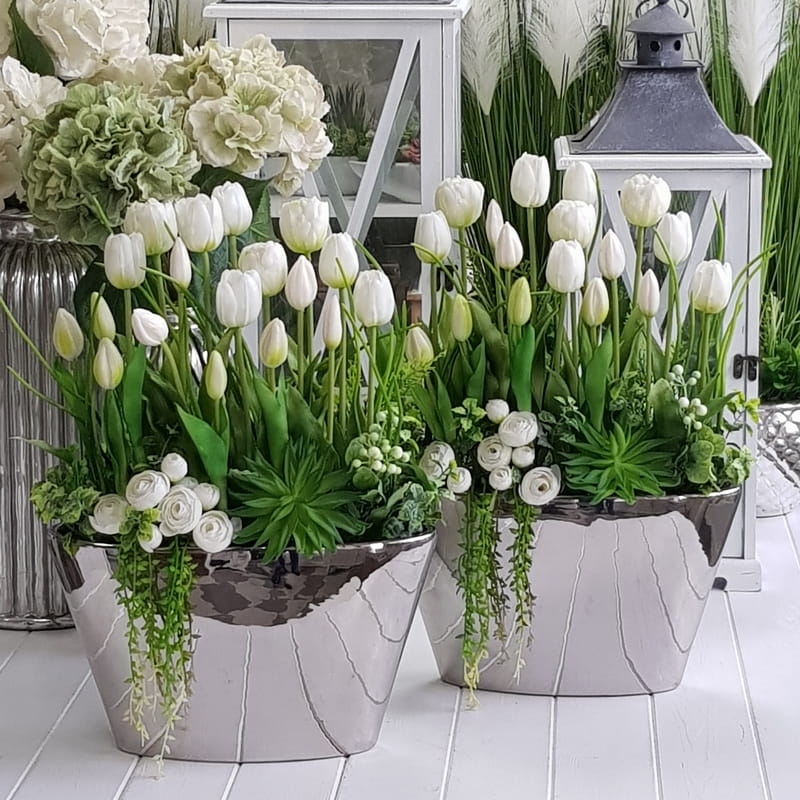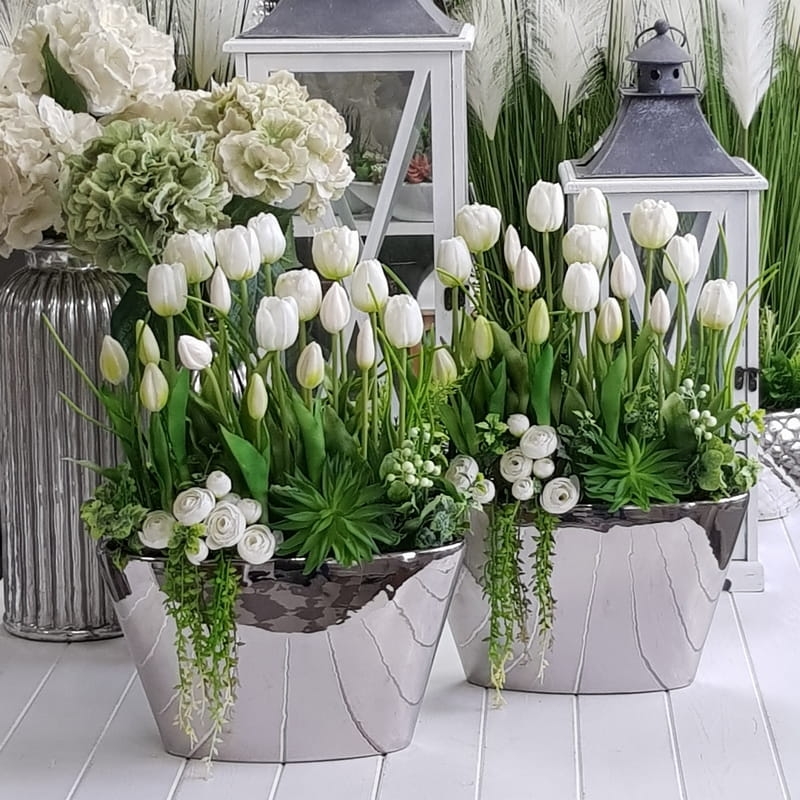 Oryginalna kompozycja roślinna, wykonana z wysokiej jakości silikonowych tulipanów, zielonych dodatków oraz ceramiki. Idealnie sprawdzi się jako ozdoba mieszkań zarówno w stylu klasycznym, jak i nowoczesnym. Pięknie będzie się prezentowała na komodzie czy parapecie. Polecamy jako oryginalny pomysł na prezent.