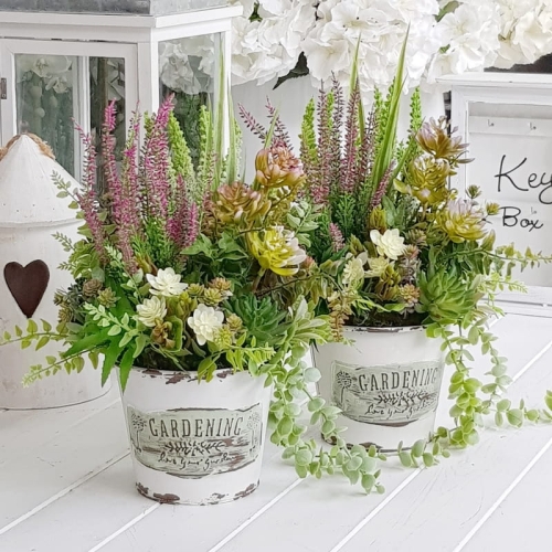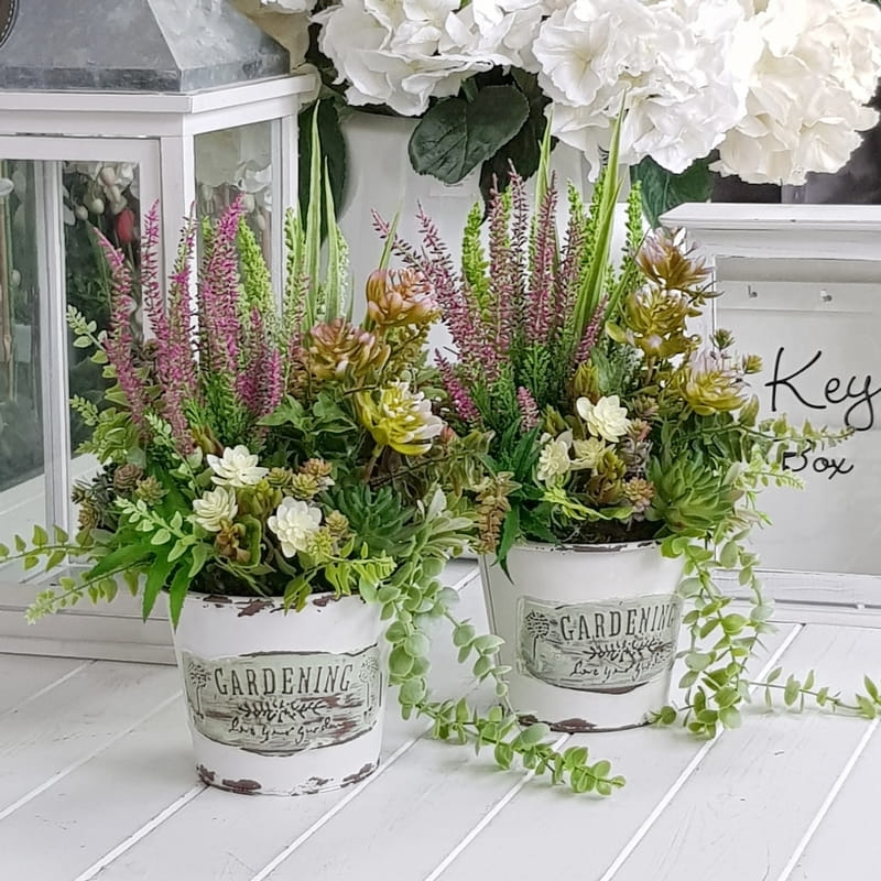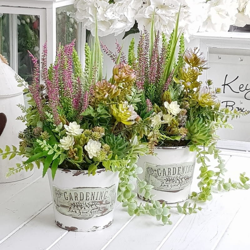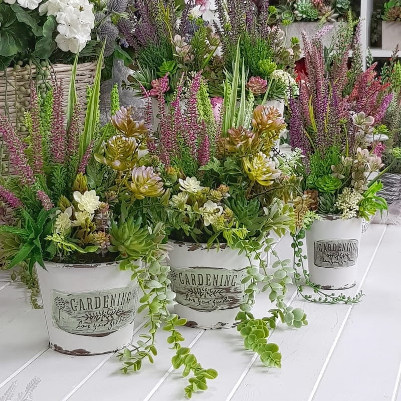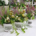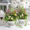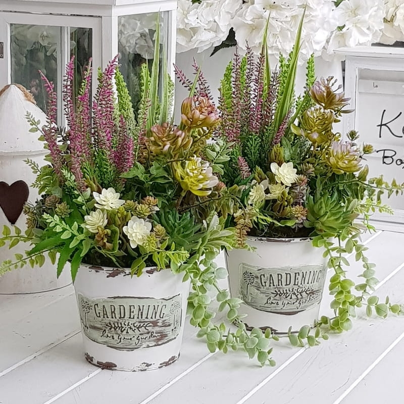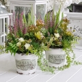 Oryginalna, kwiatowa kompozycja wykonana z wysokiej jakości roślin sztucznych i dodatków. Całość jest stworzona z dbałością o najdrobniejszy szczegół. Podstawę stanowi metalowa, lekko postarzana donica dodatkowo obciążona Wszystkie dodatki są idealnie dopasowane kolorystycznie tak, aby tworzyły spójną całość. Kompozycja nadaje się zarówno do postawienia na parapecie, komodzie czy na tarasie. Sprawdzi się również jako wyjątkowa i niebanalna dekoracja nagrobna. Idealna do sesji fotograficznych.