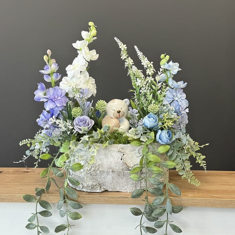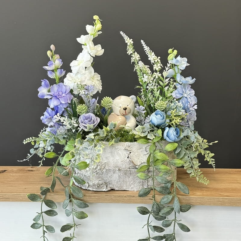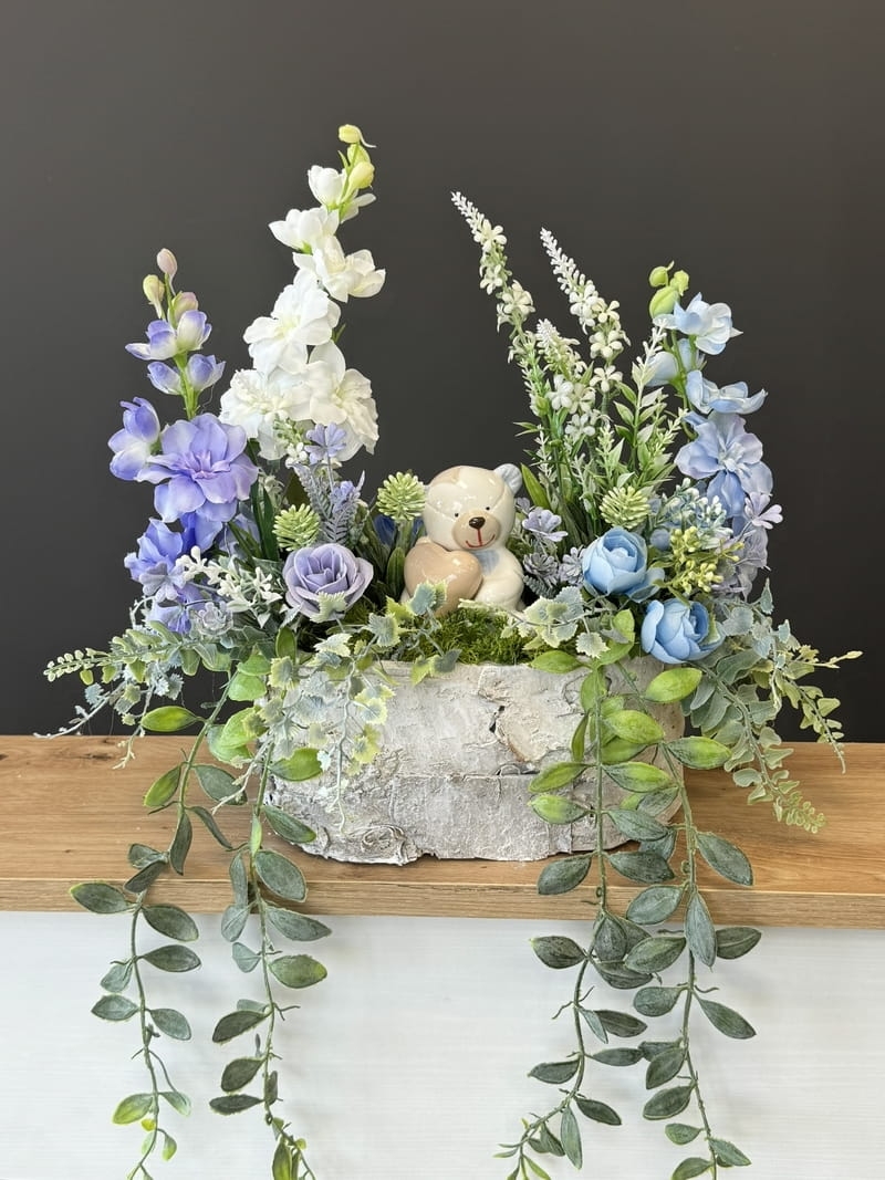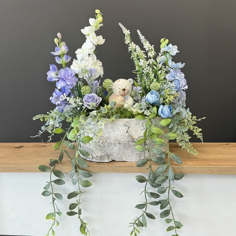Dekoracja funeralna z ceramicznym misiem osadzona w drewnianej donicy obłożonej korą. Postawa jest obciążona cementem, wypełniona dużą ilością kwiatów, liści i roślinnych dodatków w przepięknej, stonowanej kolorystyce. Szczególnego uroku dodaje jej przepiękny anioł umieszczony w kompozycji.