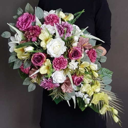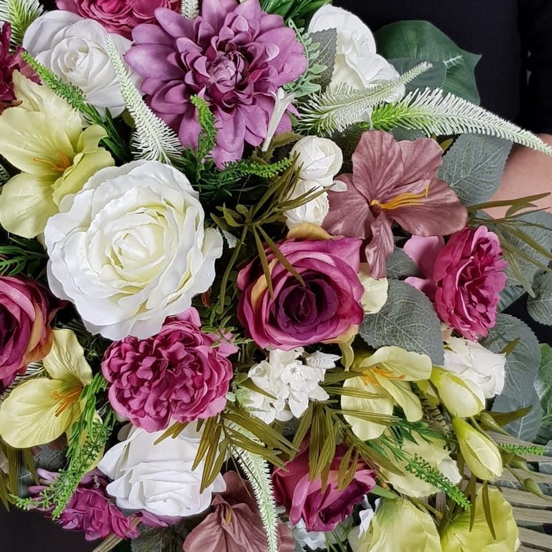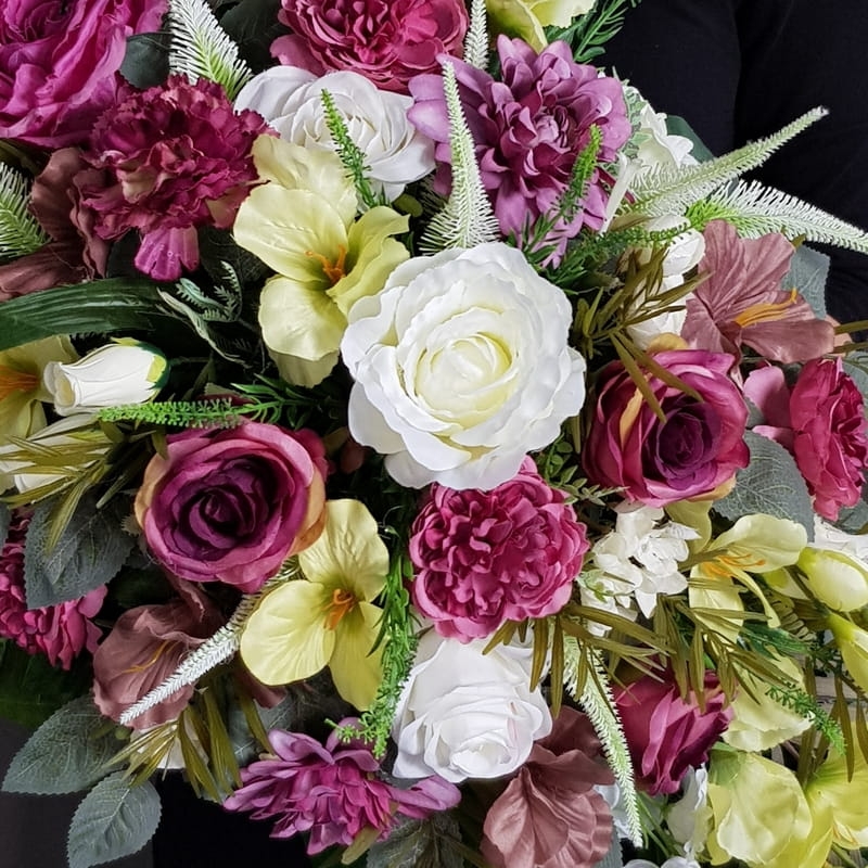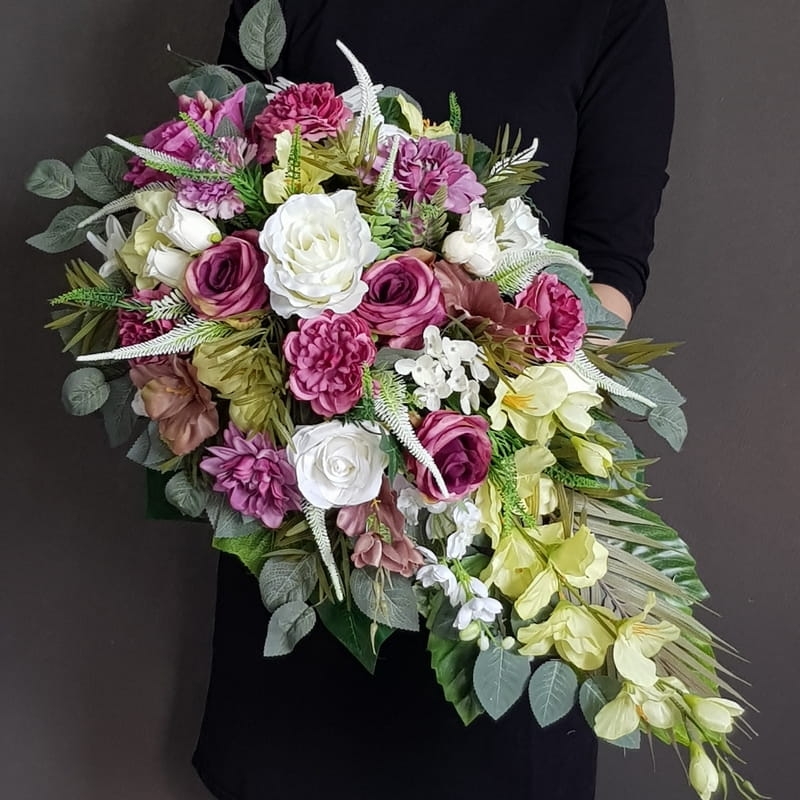 Piękna i oryginalna dekoracja jest doskonałą formą wyrażenia pamięci o bliskich. Wyszukana forma, najwyższej jakości kwiaty i perfekcyjne zestawienie kolorów sprawiają, że doskonale prezentuje się na nagrobkach.