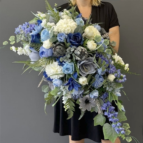 Kompozycja funeralna wiązanka nagrobna stroik na grób Gina biało-niebieska