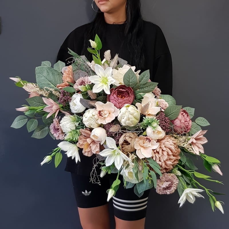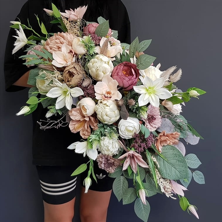 Postawa wykonana z tworzywa sztucznego,wypełniona dużą ilością kwiatów, liści i roślinnych dodatków w przepięknej, stonowanej kolorystyce. Kompozycja ma kształt kropli. Jest wydłużona jednostronnie. Dominują kwiaty w stonowanej kolorystyce oraz liście w pastelowej zieleni. Poszczególne kompozycje mogą się różnić rozkładem i rodzajami kwiatów, w zależności od dostępności, jednak kolorystyka i efekt końcowy są zawsze zachowane.
