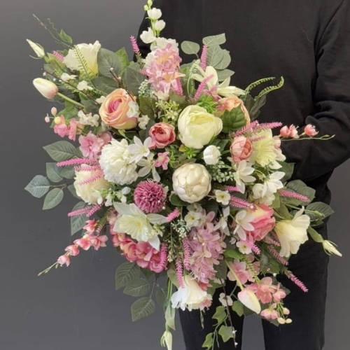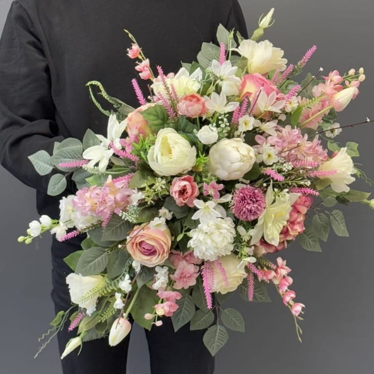 Kompozycja nagrobna z kolekcji Lorena Spring wykonana z wiosennych kwiatów została ułożona w sposób luźny, nadając jej naturalny i swobodny charakter. Całość ma formę przestrzenną, z wyraźnym wydłużeniem po obu stronach, co tworzy harmonijną, lekko asymetryczną sylwetkę.