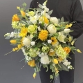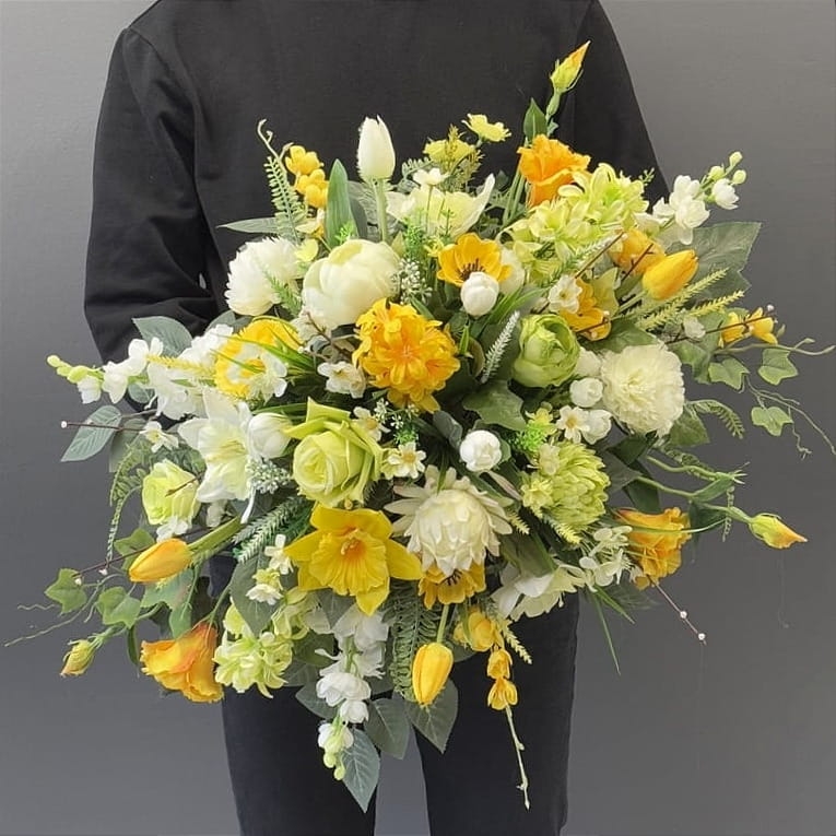 Kompozycja nagrobna z kolekcji Lorena Spring wykonana z wiosennych kwiatów została ułożona w sposób luźny, nadając jej naturalny i swobodny charakter. Całość ma formę przestrzenną, z wyraźnym wydłużeniem po obu stronach, co tworzy harmonijną, lekko asymetryczną sylwetkę.