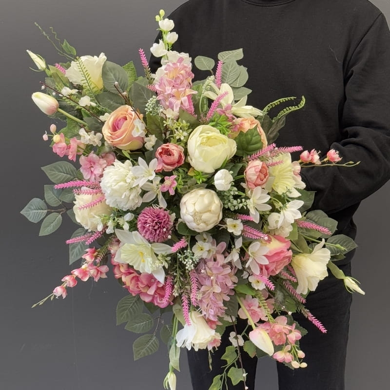 Kompozycja nagrobna z kolekcji Lorena Spring wykonana z wiosennych kwiatów została ułożona w sposób luźny, nadając jej naturalny i swobodny charakter. Całość ma formę przestrzenną, z wyraźnym wydłużeniem po obu stronach, co tworzy harmonijną, lekko asymetryczną sylwetkę.