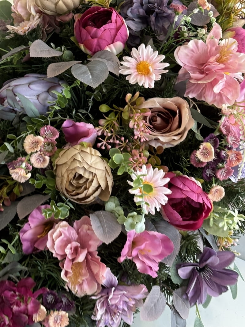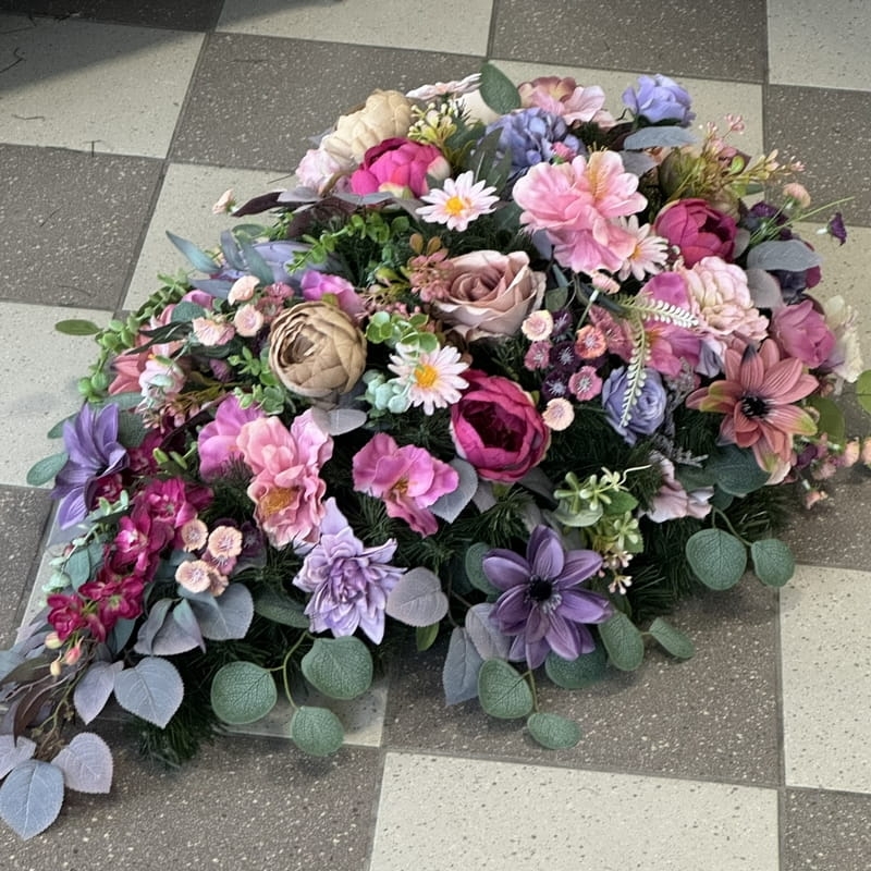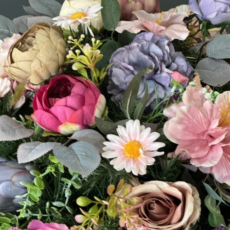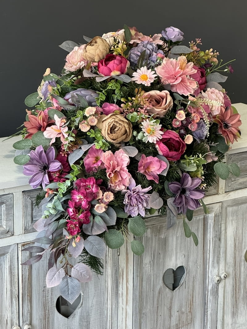 Piękna i wyszukana dekoracja jest doskonałą formą wyrażenia pamięci o bliskich. Oryginalna forma, najwyższej jakości kwiaty i perfekcyjne zestawienie kolorów sprawiają, że doskonale prezentuje się na nagrobkach.