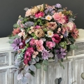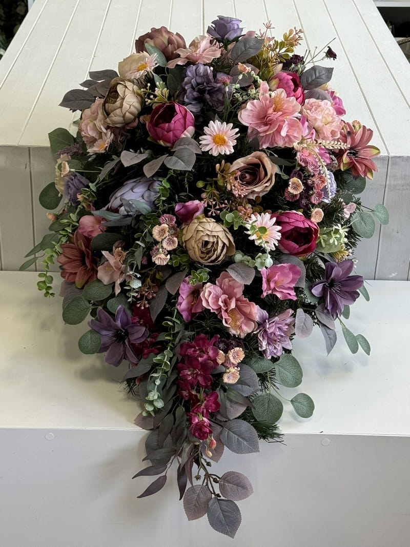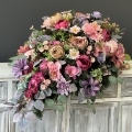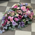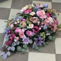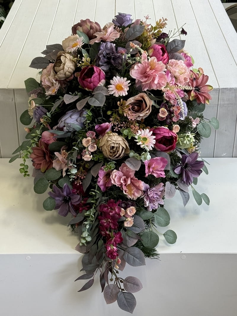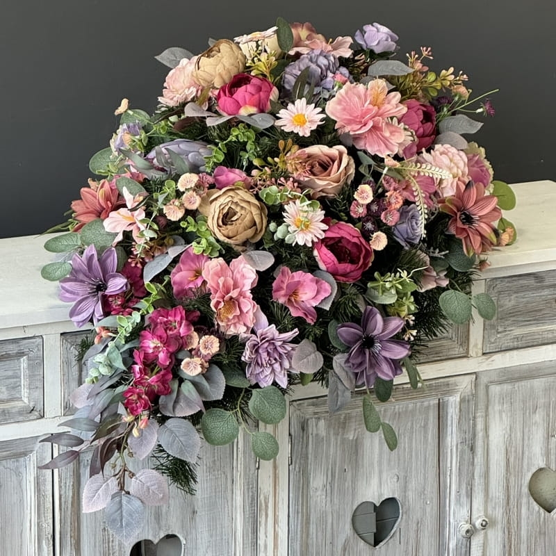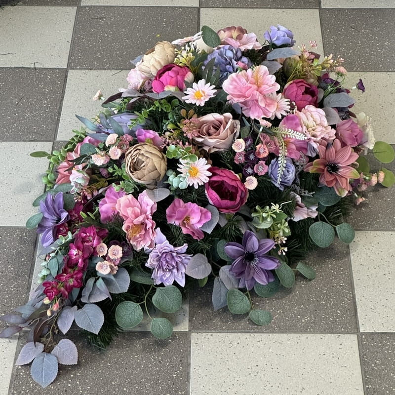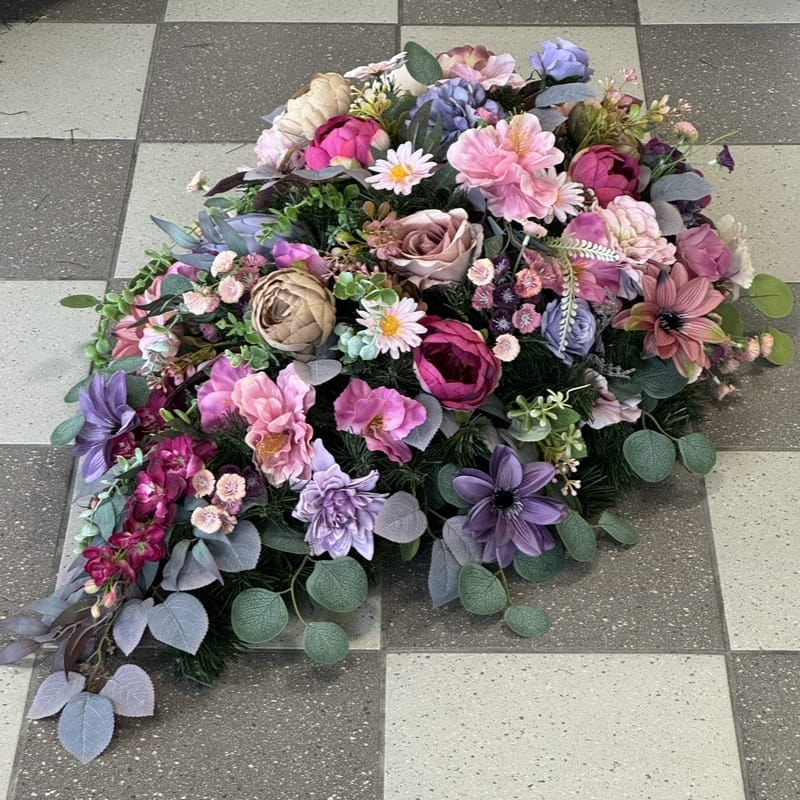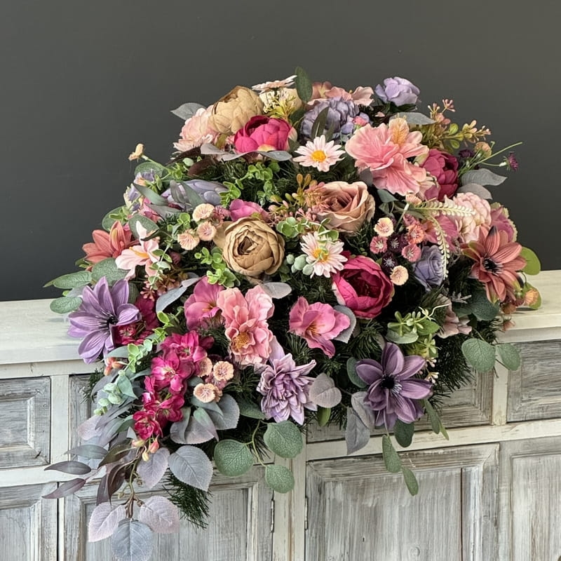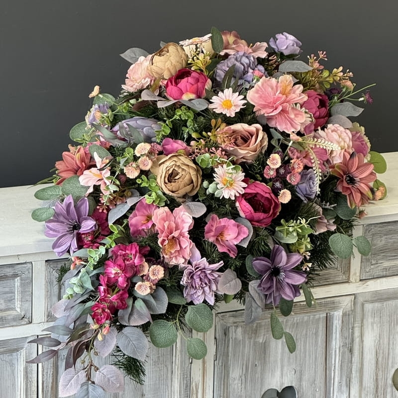 Dekoracja funeralna w postaci kompozycji na płytę nagrobkową. Całość osadzona na podkładzie ze sztucznego świerku, wypełniona dużą ilością kwiatów, liści i roślinnych dodatków w przepięknej, stonowanej kolorystyce. Kompozycja ma rozmiar XXL i kształt wydłużonej kropli. Polecana jest głównie na duże nagrobki lub rodzinne grobowce.