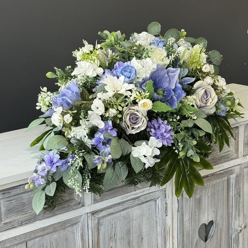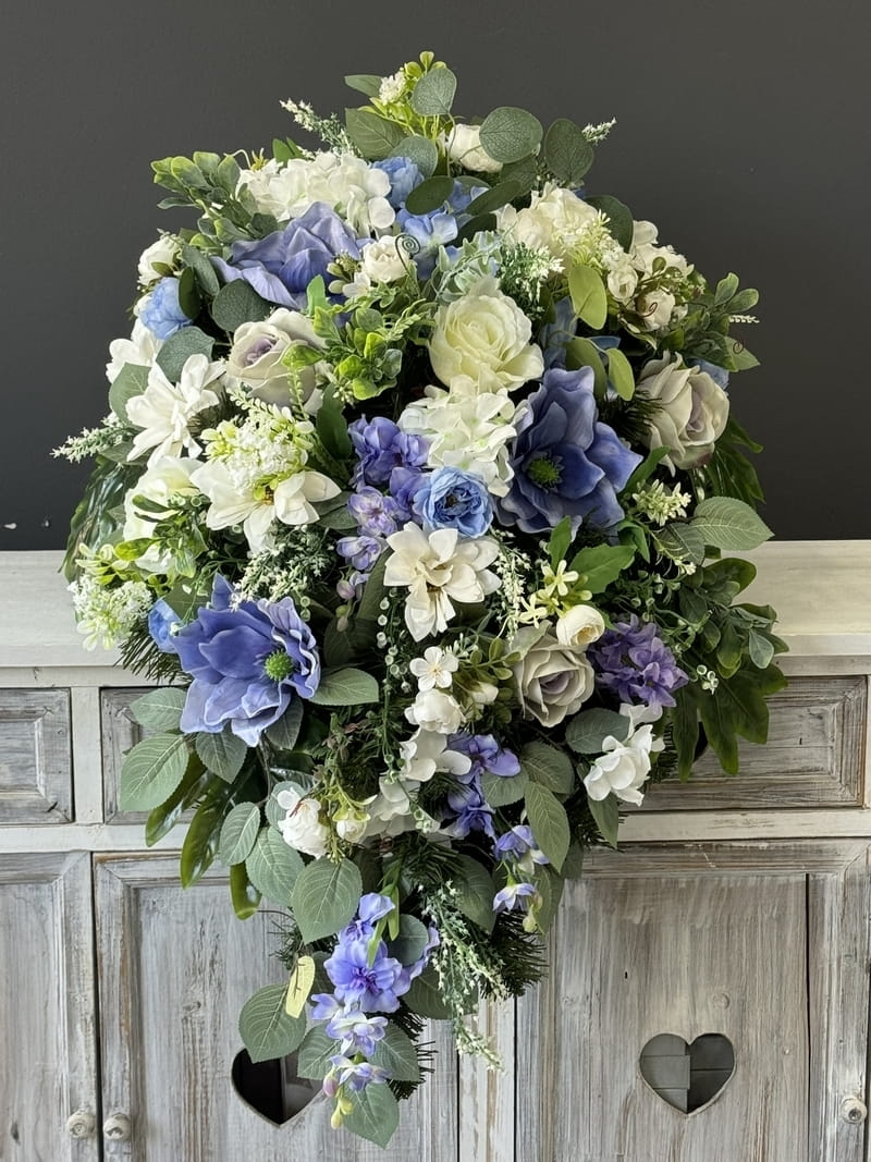 Piękna i wyszukana dekoracja jest doskonałą formą wyrażenia pamięci o bliskich. Oryginalna forma, najwyższej jakości kwiaty i perfekcyjne zestawienie kolorów sprawiają, że doskonale prezentuje się na nagrobkach.