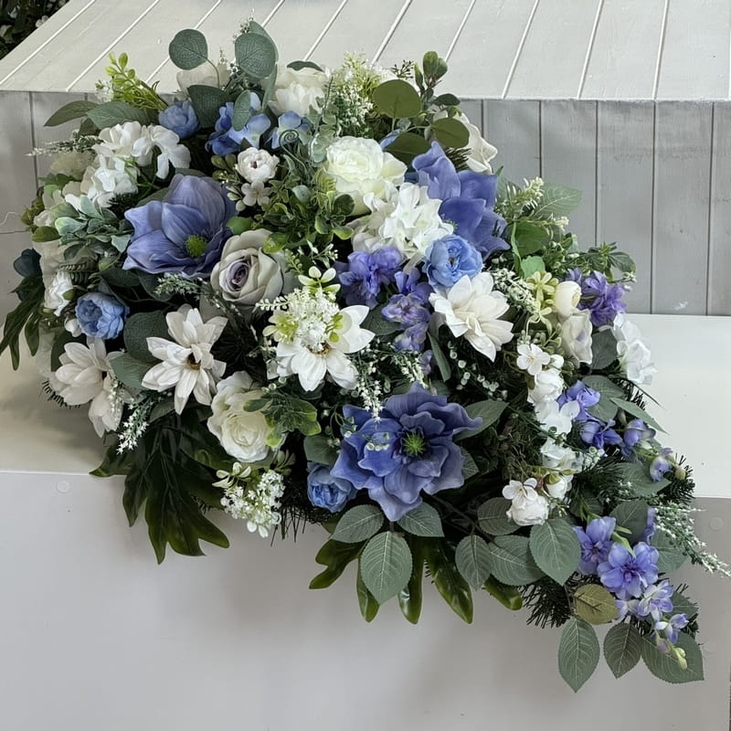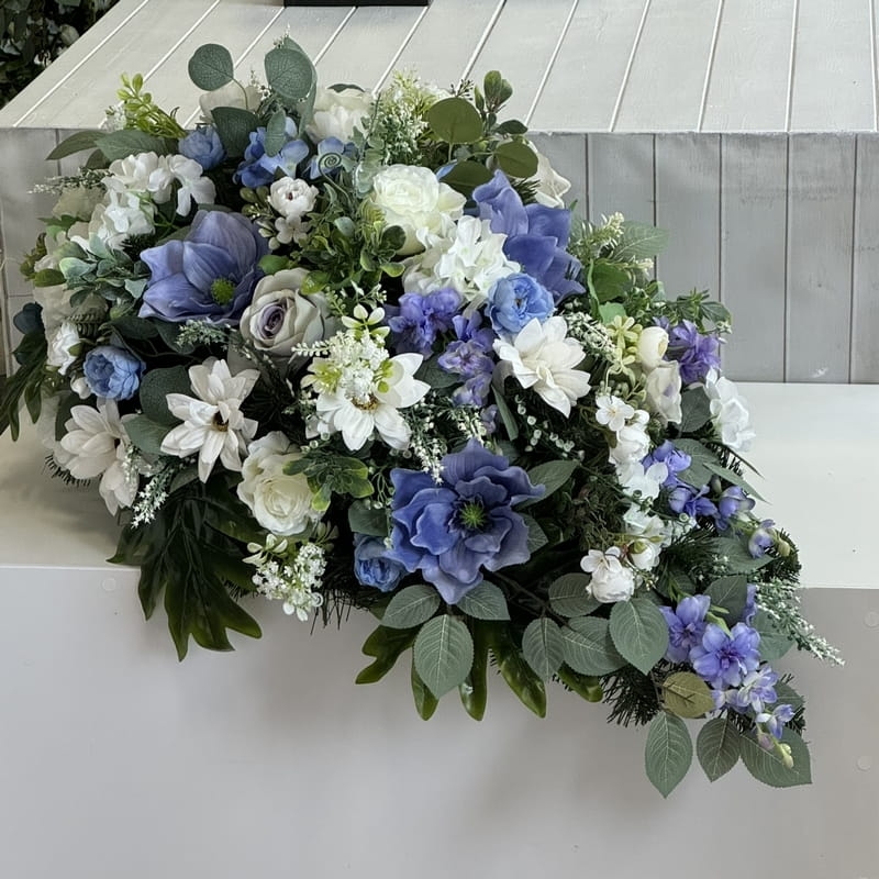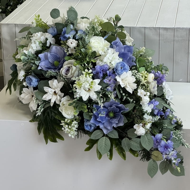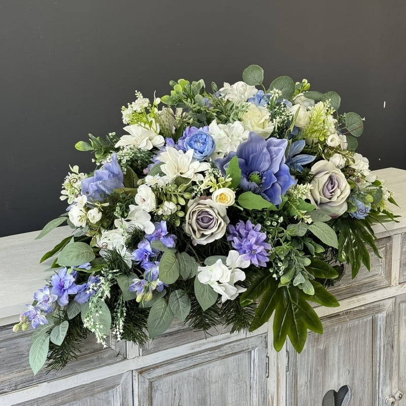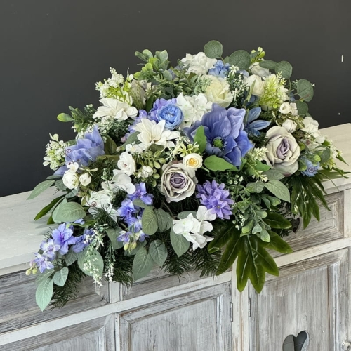 Dekoracja funeralna w postaci kompozycji na płytę nagrobkową. Całość osadzona na podkładzie ze sztucznego świerku, wypełniona dużą ilością kwiatów, liści i roślinnych dodatków w przepięknej, stonowanej kolorystyce. Kompozycja ma rozmiar XXL i kształt wydłużonej kropli. Polecana jest głównie na duże nagrobki lub rodzinne grobowce.