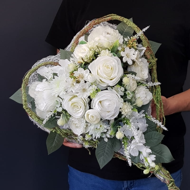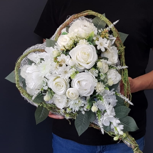 Dekoracja funeralna w postaci kwiatowego serca, gotowego do umieszczenia na płycie nagrobkowej. Postawa serca jest wykonana na stelażu pokrytym naturalną faszyną. Została dodatkowo obciążona cementem i wypełniona dużą ilością kwiatów w przepięknej, stonowanej kolorystyce. Szczególnego uroku dodają jej korzenie, uwydatniające i podkreślające kształt serca.
