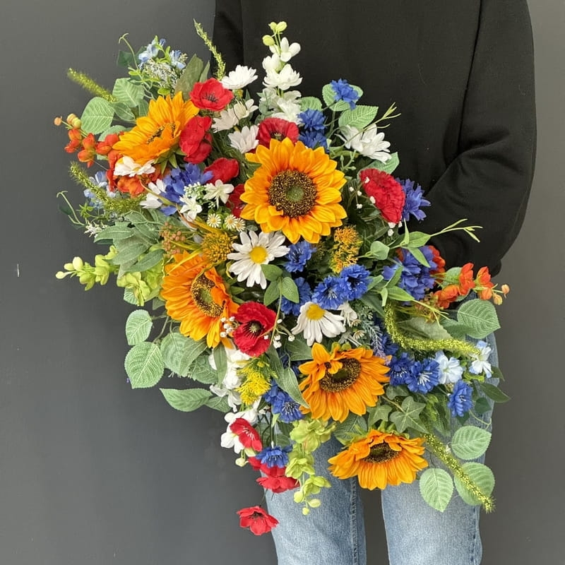 Oryginalna kompozycja nagrobna w obustronnie wydłużona, wykonana z wysokiej jakości roślin sztucznych w letnich kolorach.