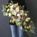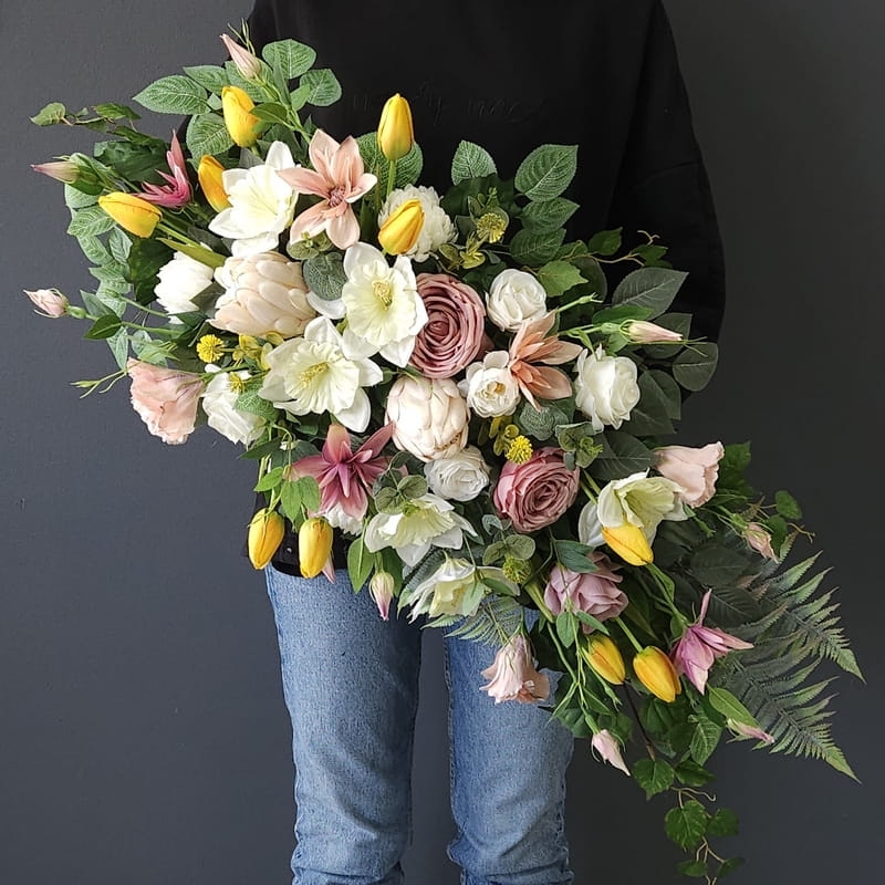 Postawa wykonana z tworzywa sztucznego,wypełniona dużą ilością kwiatów, liści i roślinnych dodatków w przepięknej, stonowanej kolorystyce. Kompozycja ma kształt kropli. Jest wydłużona jednostronnie. Dominują kwiaty w stonowanej kolorystyce oraz liście w pastelowej zieleni. Poszczególne kompozycje mogą się różnić rozkładem i rodzajami kwiatów, w zależności od dostępności, jednak kolorystyka i efekt końcowy są zawsze zachowane.