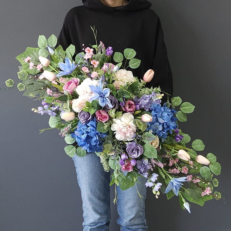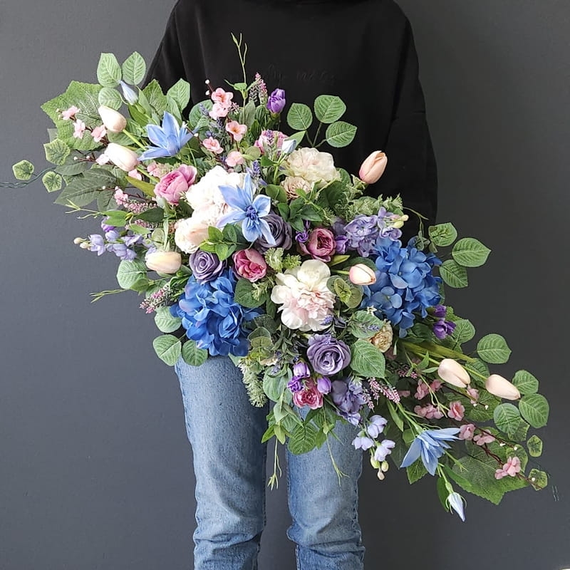 Postawa wykonana z tworzywa sztucznego,wypełniona dużą ilością kwiatów, liści i roślinnych dodatków w przepięknej, stonowanej kolorystyce. Kompozycja ma kształt kropli. Jest wydłużona jednostronnie. Dominują kwiaty w stonowanej kolorystyce oraz liście w pastelowej zieleni. Poszczególne kompozycje mogą się różnić rozkładem i rodzajami kwiatów, w zależności od dostępności, jednak kolorystyka i efekt końcowy są zawsze zachowane.