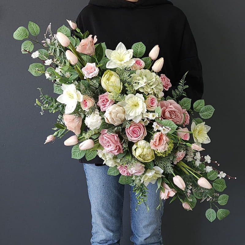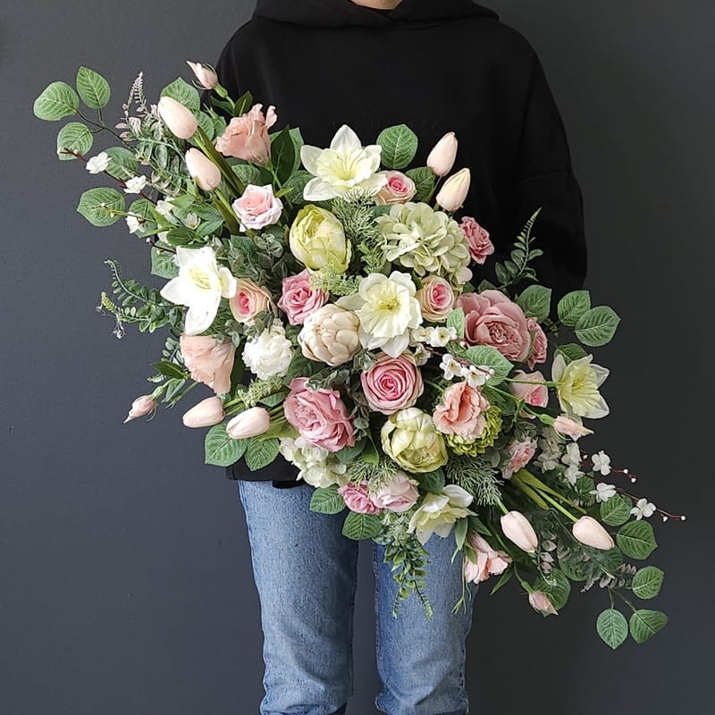 Postawa wykonana z tworzywa sztucznego,wypełniona dużą ilością kwiatów, liści i roślinnych dodatków w przepięknej, stonowanej kolorystyce. Kompozycja ma kształt kropli. Jest wydłużona jednostronnie. Dominują kwiaty w stonowanej kolorystyce oraz liście w pastelowej zieleni. Poszczególne kompozycje mogą się różnić rozkładem i rodzajami kwiatów, w zależności od dostępności, jednak kolorystyka i efekt końcowy są zawsze zachowane.