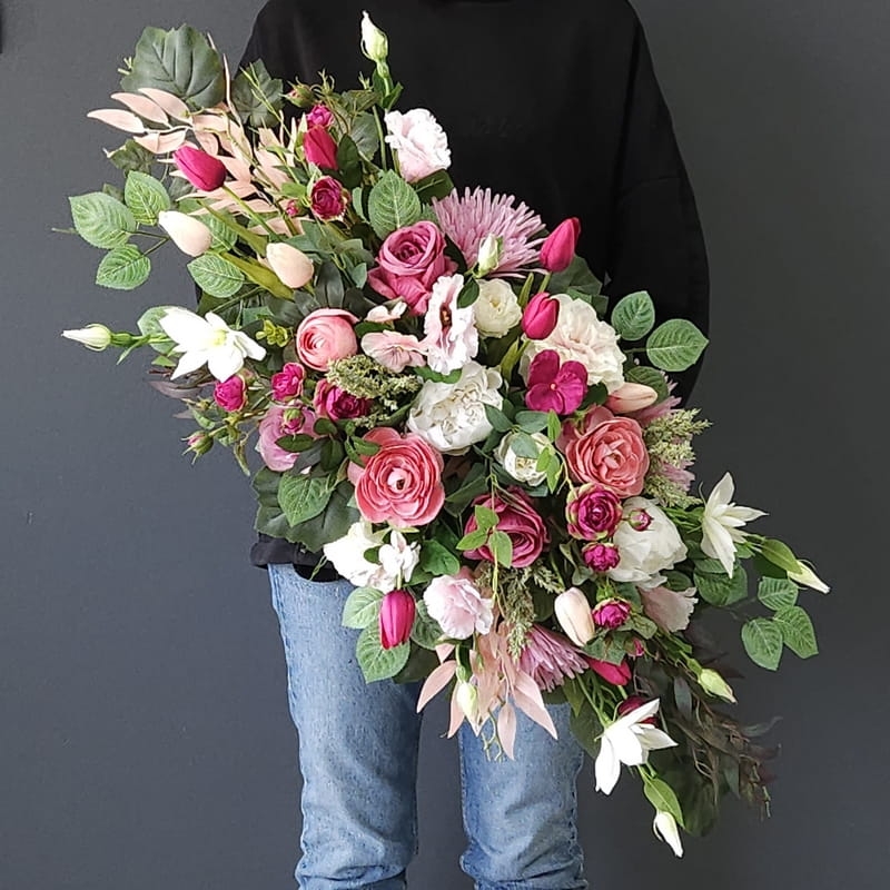Postawa wykonana z tworzywa sztucznego,wypełniona dużą ilością kwiatów, liści i roślinnych dodatków w przepięknej, stonowanej kolorystyce. Kompozycja ma kształt kropli. Jest wydłużona jednostronnie. Dominują kwiaty w stonowanej kolorystyce oraz liście w pastelowej zieleni. Poszczególne kompozycje mogą się różnić rozkładem i rodzajami kwiatów, w zależności od dostępności, jednak kolorystyka i efekt końcowy są zawsze zachowane.