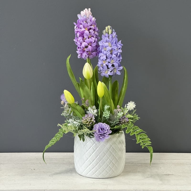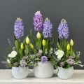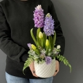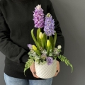 Oryginalna kompozycja roślinna, wykonana z wysokiej jakości hiacyntów, zielonych dodatków oraz ceramiki. Idealnie sprawdzi się jako ozdoba mieszkań zarówno w stylu klasycznym, jak i nowoczesnym. Pięknie będzie się prezentowała na komodzie czy parapecie. Polecamy jako oryginalny pomysł na prezent.