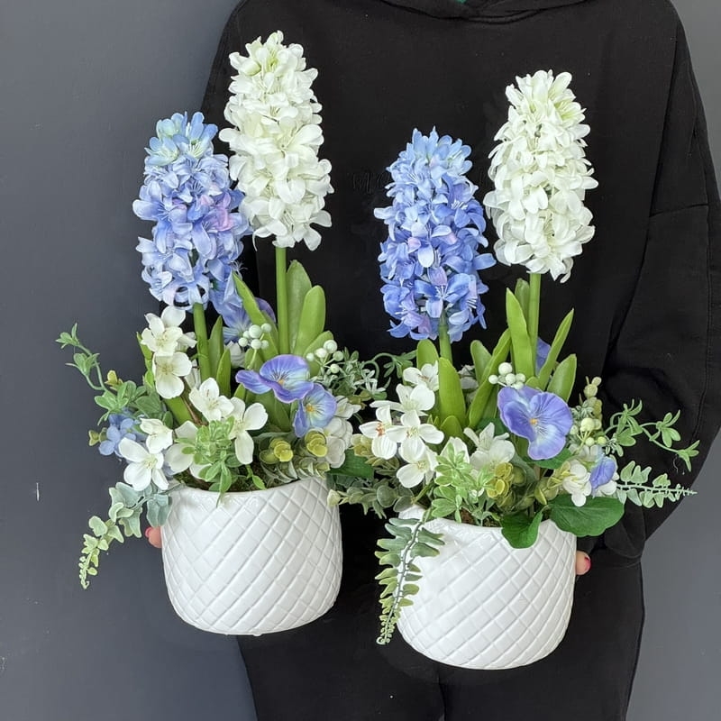 Oryginalna kompozycja roślinna, wykonana z wysokiej jakości hiacyntów, zielonych dodatków oraz ceramiki. Idealnie sprawdzi się jako ozdoba mieszkań zarówno w stylu klasycznym, jak i nowoczesnym. Pięknie będzie się prezentowała na komodzie czy parapecie. Polecamy jako oryginalny pomysł na prezent.