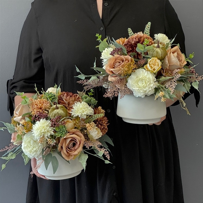 Kompozycja jesienna „Rumia" umieszczona w niskiej ceramicznej misie łączy elegancję z przytulnym, jesiennym klimatem. W aranżacji zastosowano sztuczne kwiaty w delikatnych odcieniach kremu, beżu, brudnego różu oraz różnych tonach brązu, które harmonijnie łączą się z sezonowymi dodatkami.