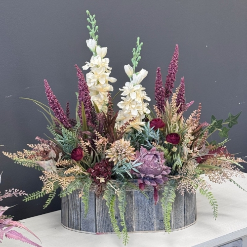 Delikatna aranżacja, w której główną rolę odgrywają wrzosy w różnych odcieniach. Uzupełnione sezonowymi dodatkami tworzą elegancką, jesienną dekorację, która ociepli każde wnętrze i nada mu wyjątkowego charakteru. Idealna także jako prezent w subtelnym, jesiennym stylu.
