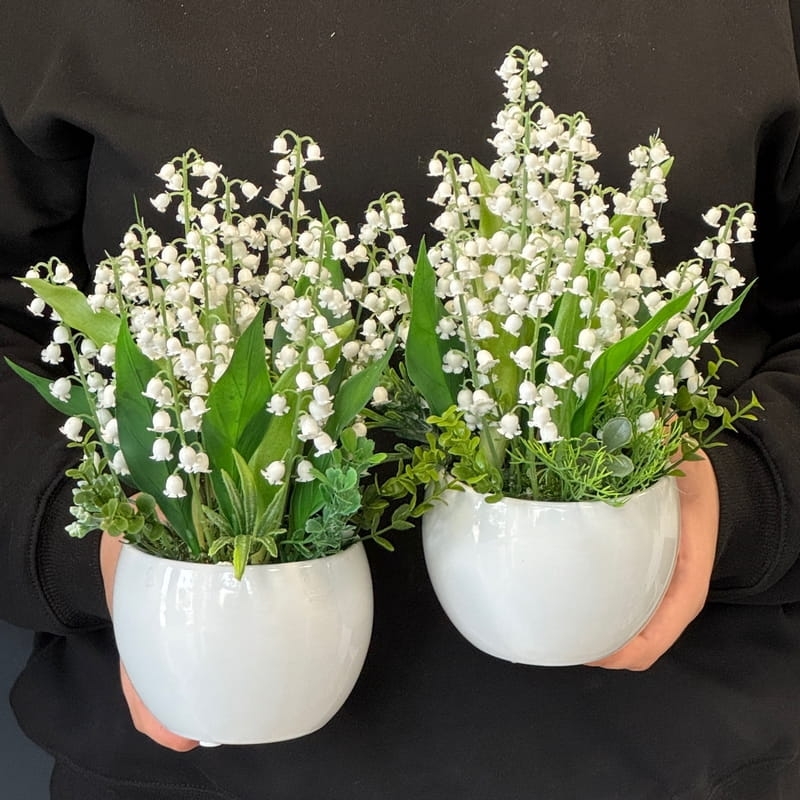 W kompozycji z silikonowych konwalii skupiono się na prostocie, lekkości i naturalnym rytmie. Kwiaty rozmieszczono swobodnie, z zachowaniem przestrzeni między łodygami, co pozwoliło uzyskać wrażenie lekkości i świeżości. Delikatne, białe dzwonki osadzono na pędach, które ukierunkowano ku górze i na boki, imitując ich naturalny wzrost w środowisku leśnym.