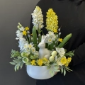 Wyjątkowa kompozycja z hiacyntów w ceramicznej donicy to stylowa dekoracja, która wprowadza do wnętrza świeżość i subtelny, wiosenny klimat. Starannie dobrane kwiaty w odcieniach bieli i błękitu, uzupełnione drobnymi dodatkami i naturalnie wyglądającą zielenią, tworzą harmonijną i elegancką całość.