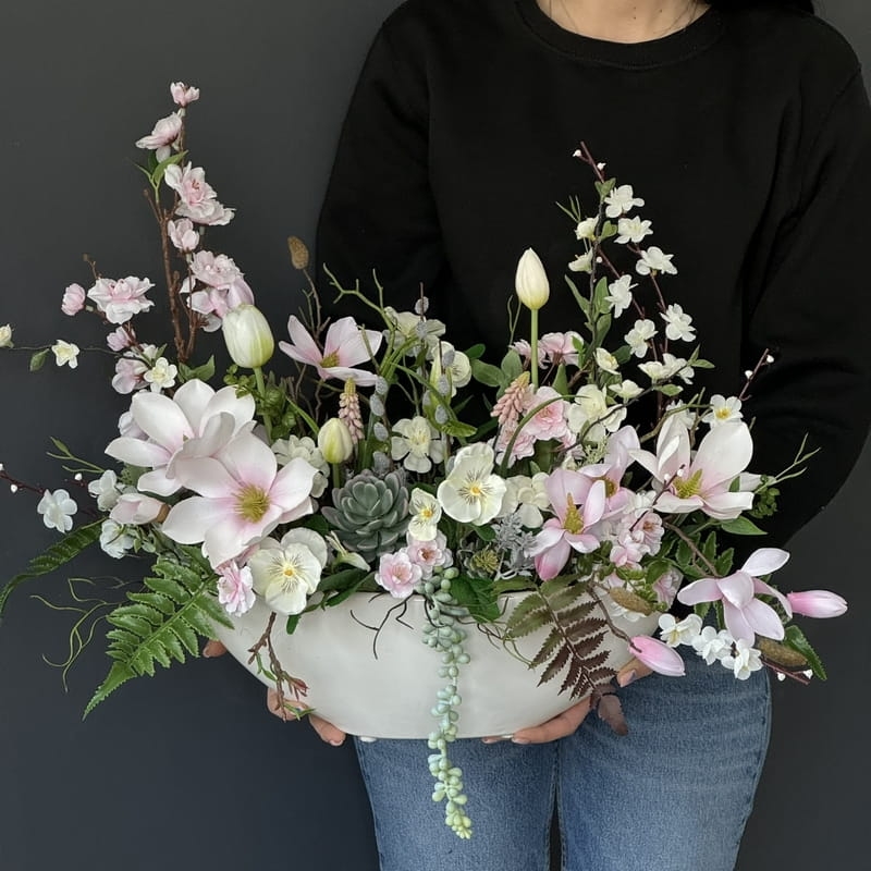 Całoroczna kompozycja kwiatowa, wykonana z kwiatów wysokiej jakości i zielonych dodatków. Całość osadzona w ceramicznej donicy. Kompozycja wykonana jest dość luźno, ma przestrzenny charakter. Stonowana kolorystyka, uzupełniona zielenią liści sprawia, że kompozycja dopasuje się do różnych rodzajów wnętrz. Dekoracja z każdej strony wygląda nieco inaczej. Polecamy do domów prywatnych, ale również do obiektów użyteczności publicznej. Nasze kompozycje to wspaniałe uzupełnienie hotelowych i restauracyjnych wnętrz, a także salonów spa, gabinetów kosmetycznych i lekarskich, klinik i poradni.